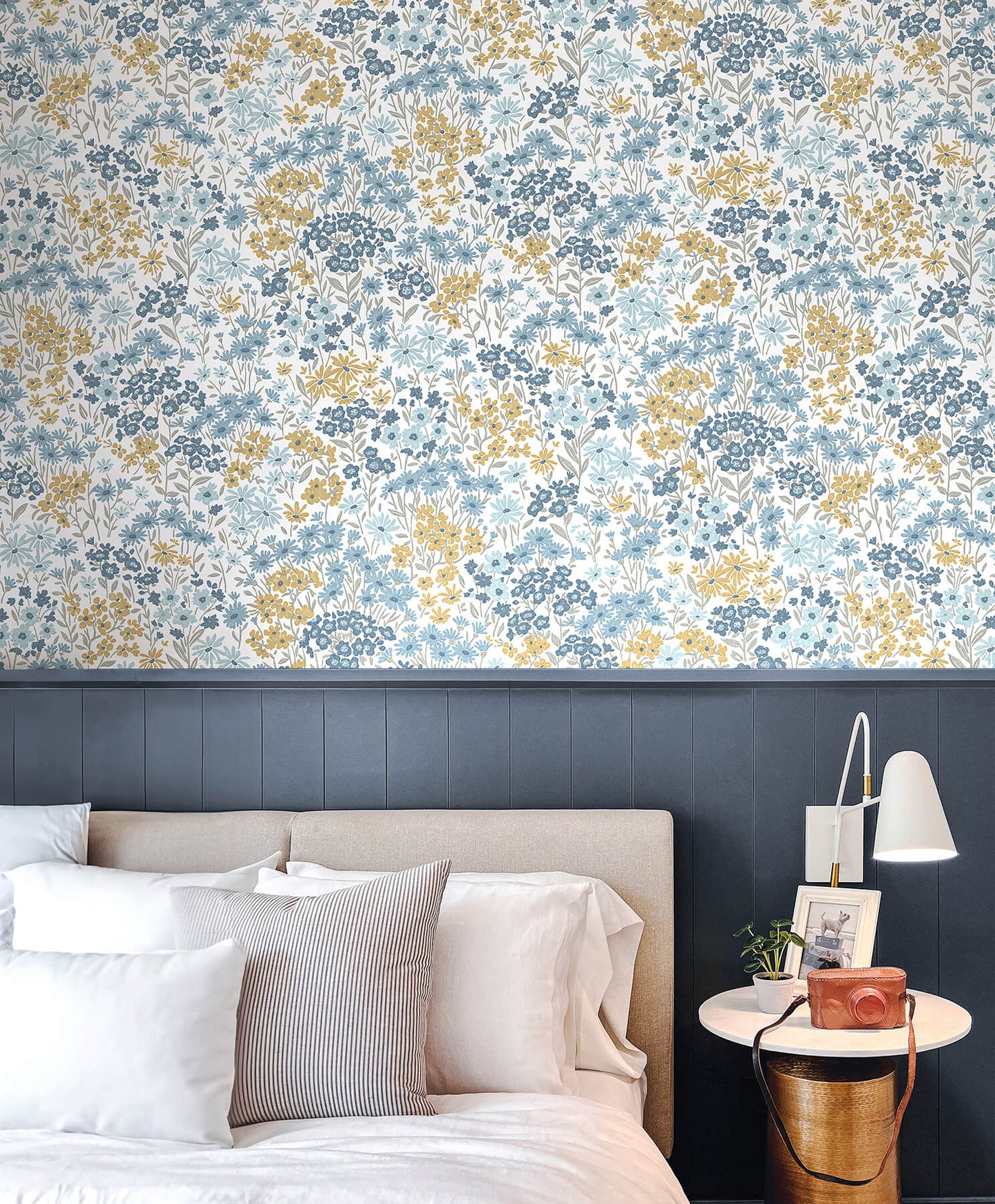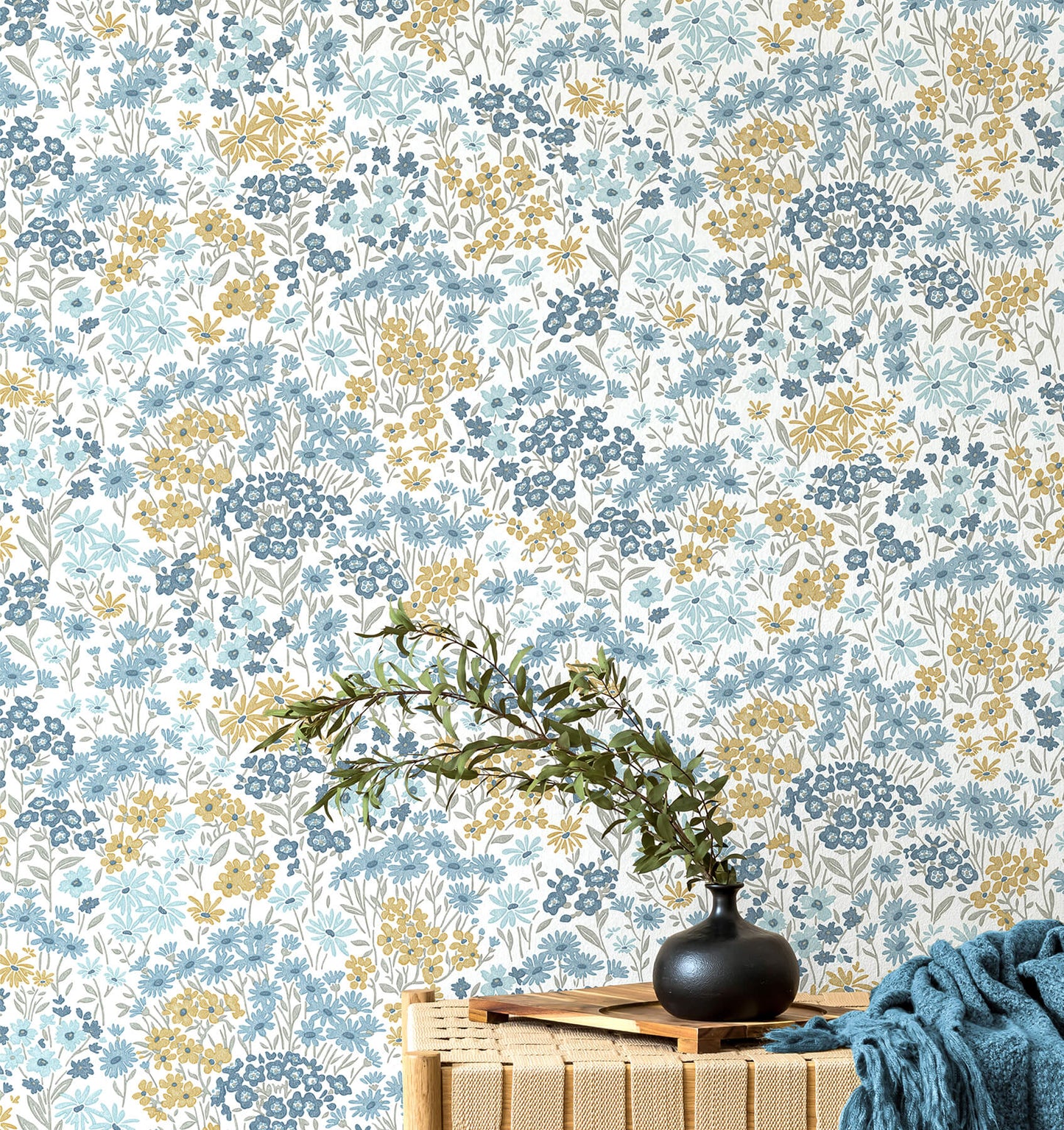 Fresh, springtime joy graces your walls with this illustrated wallpaper featuring a field of wild daises with cheerful blue and yellow blooms offset against creamy white. Ditsy is an unpasted, non woven wallpaper measuring 20.5 inches wide by 33 feet long, covering approximately About 56.4 square feet square feet per roll. Escape into the tranquil beauty of the countryside. These breath taking patterns bring the serene charm of nature into your living space, transforming any room into a peaceful retreat.