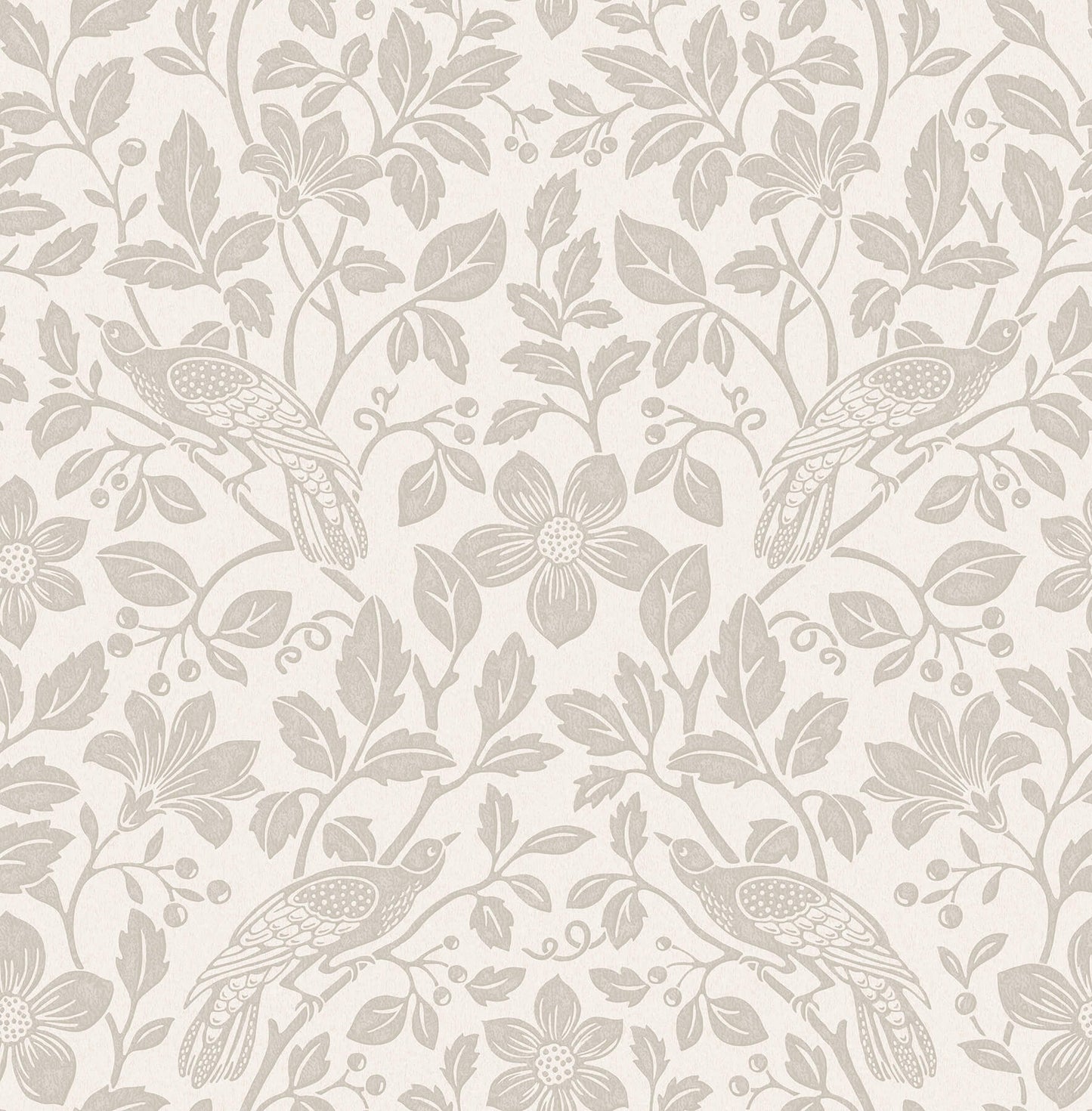 Birds perch within twining floral vines and search for ripe berries in this charming botanical wallpaper, the details inked in cool beige against a creamy white backdrop. Marlow is an unpasted, non woven wallpaper measuring 20.5 inches wide by 33 feet long, covering approximately About 56.4 square feet square feet per roll. Escape into the tranquil beauty of the countryside. These breath taking patterns bring the serene charm of nature into your living space, transforming any room into a peaceful retreat.