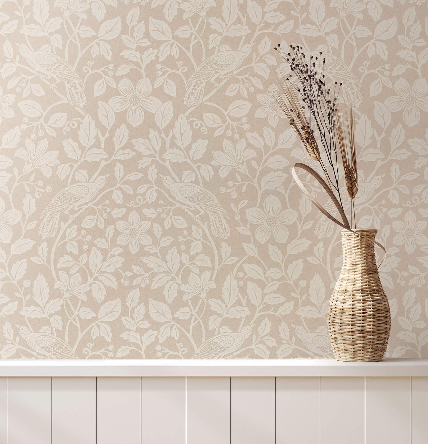 Birds perch within twining floral vines and search for ripe berries in this charming botanical wallpaper, the details inked in white against a warm beige backdrop. Marlow is an unpasted, non woven wallpaper measuring 20.5 inches wide by 33 feet long, covering approximately About 56.4 square feet square feet per roll. Escape into the tranquil beauty of the countryside. These breath taking patterns bring the serene charm of nature into your living space, transforming any room into a peaceful retreat.