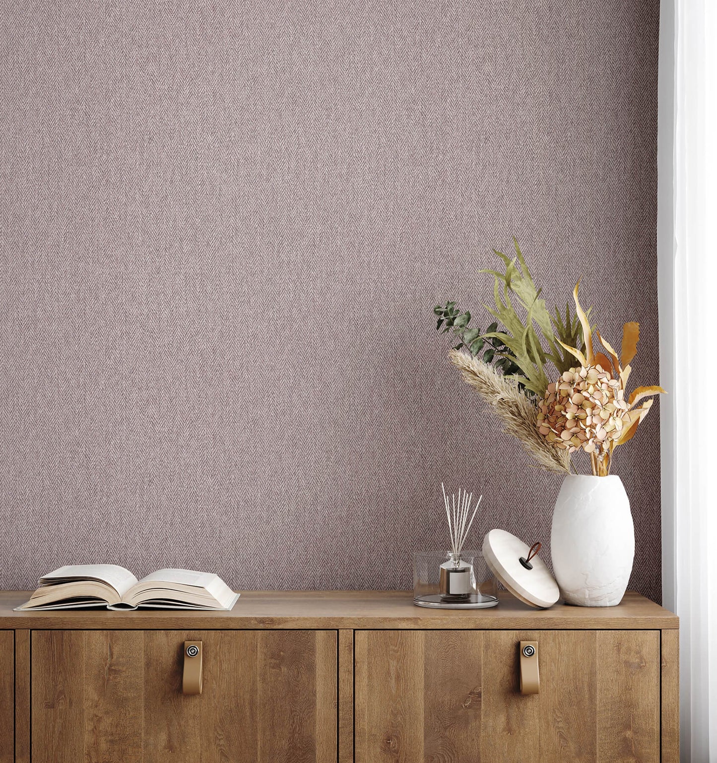 This petite herringbone print is reminiscent of fine tweed fabric, given a fresh feel with a palette of lavender and plum. Herringbone is an unpasted, non woven wallpaper measuring 20.5 inches wide by 33 feet long, covering approximately About 56.4 square feet square feet per roll. Escape into the tranquil beauty of the countryside. These breath taking patterns bring the serene charm of nature into your living space, transforming any room into a peaceful retreat.