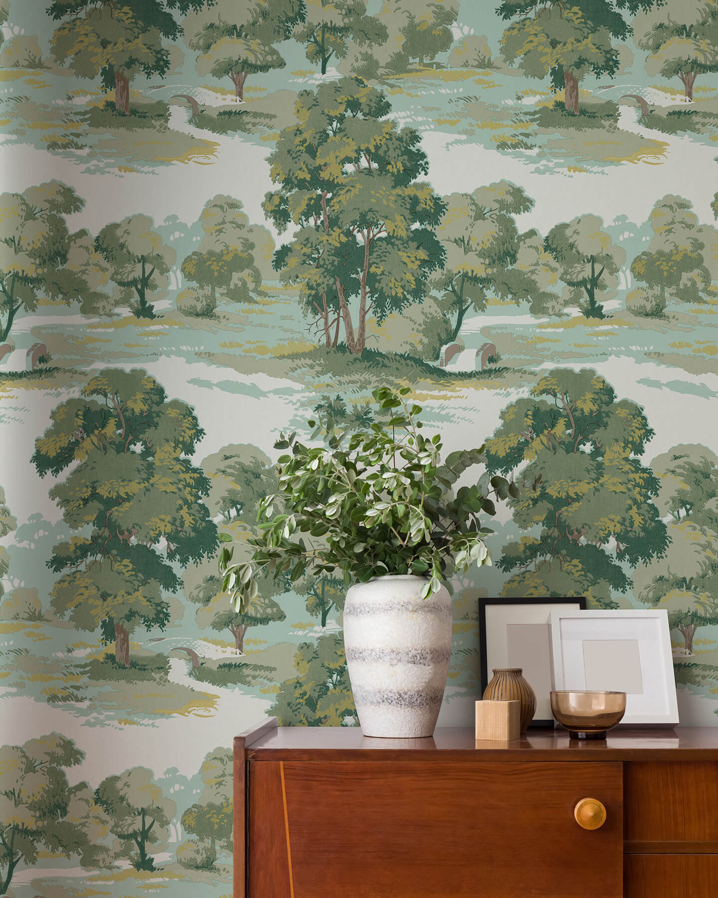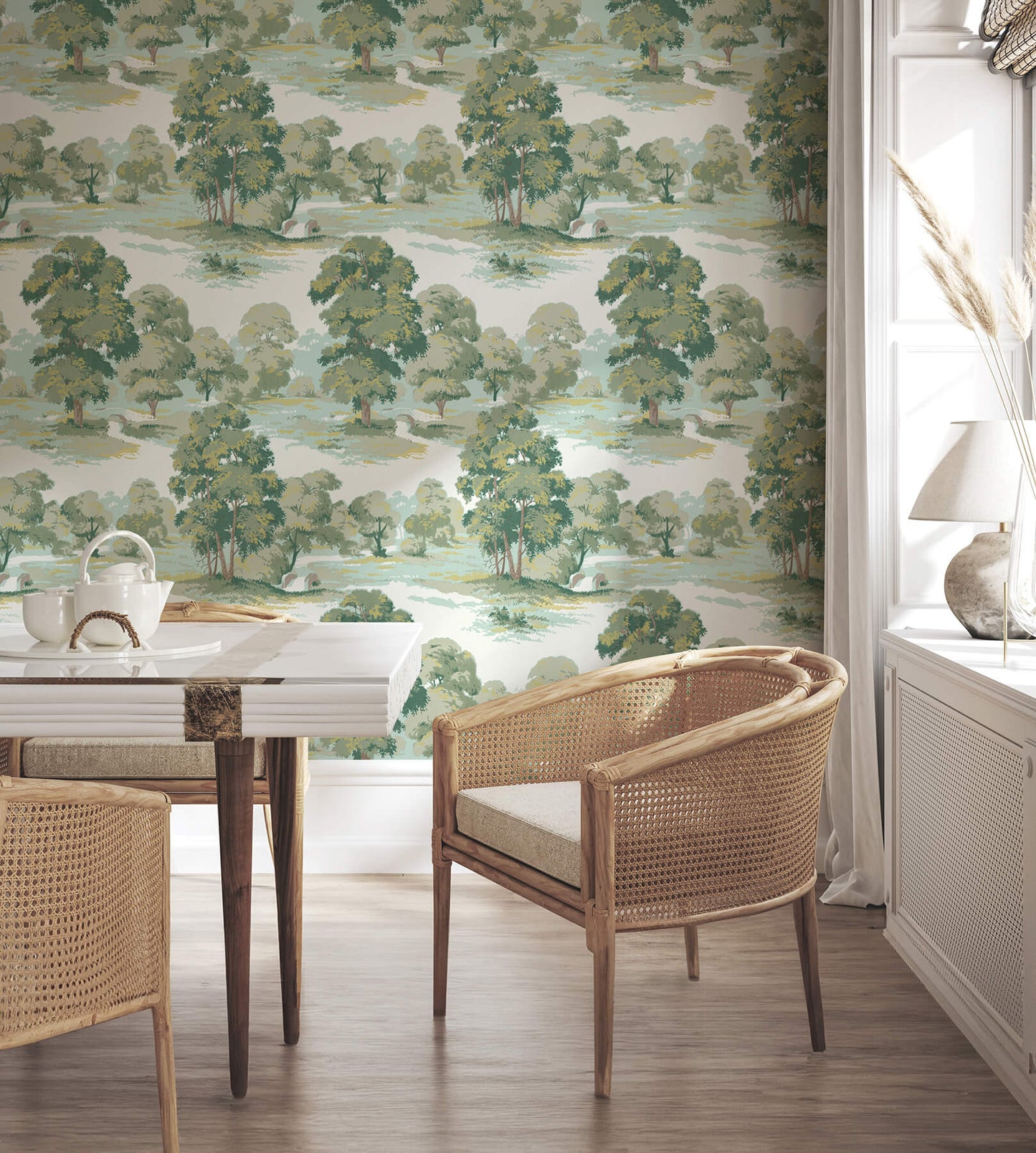 Stroll through a soothing woodland park with this picturesque scenic wallpaper, detailed here in shades of green accented by aqua and given subtle texture with raised inks. Sherwood is an unpasted, non woven wallpaper measuring 20.5 inches wide by 33 feet long, covering approximately About 56.4 square feet square feet per roll. Escape into the tranquil beauty of the countryside. These breath taking patterns bring the serene charm of nature into your living space, transforming any room into a peaceful retreat.