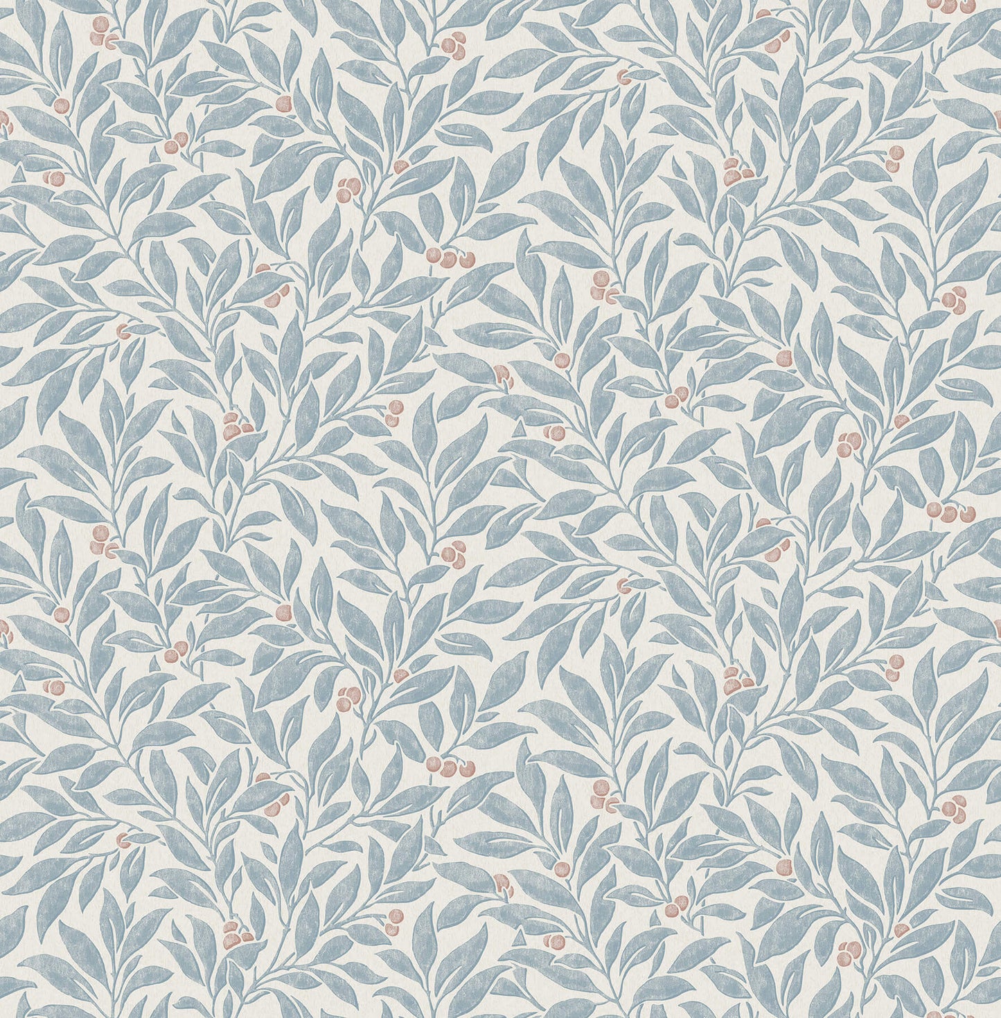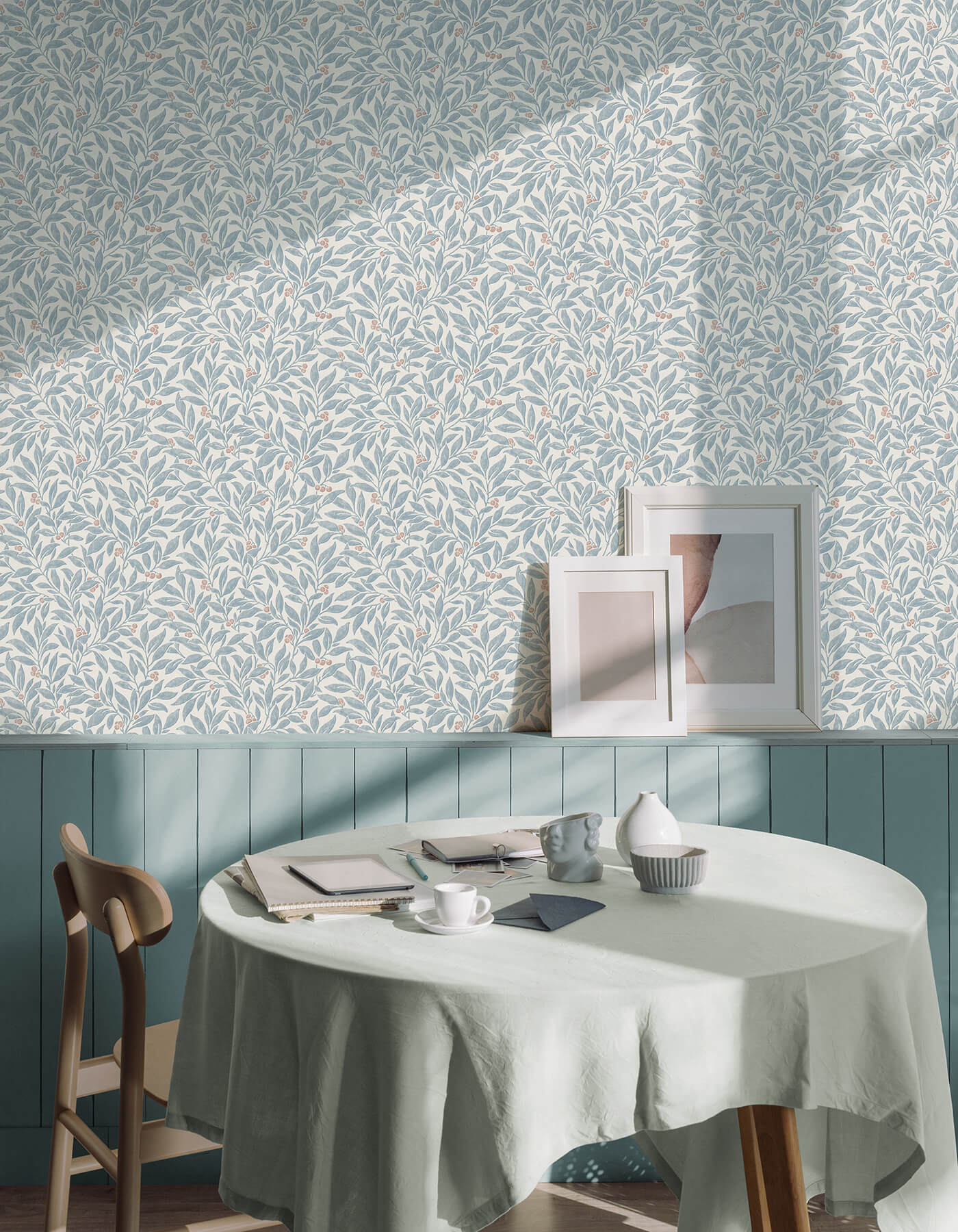 Leafy light blue boughs decorated with pale red berries, all offset against a cream backdrop, make for a timeless and charming botanical wallpaper. Winter Berry is an unpasted, non woven wallpaper measuring 20.5 inches wide by 33 feet long, covering approximately About 56.4 square feet square feet per roll. Escape into the tranquil beauty of the countryside. These breath taking patterns bring the serene charm of nature into your living space, transforming any room into a peaceful retreat.