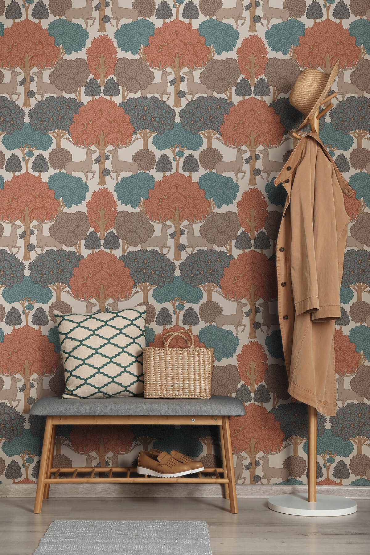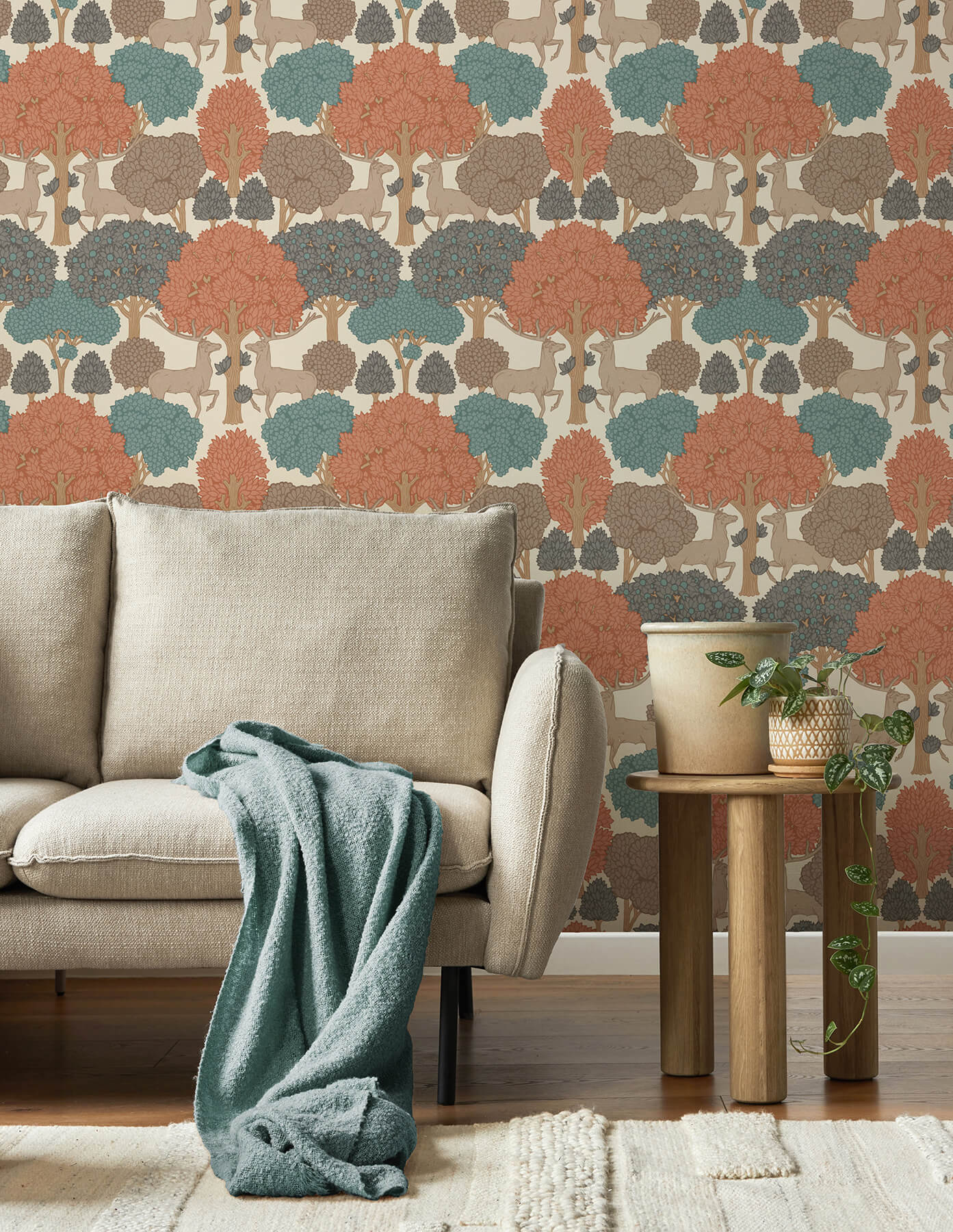 Proud stags march through a woodland forest in this gorgeous wallpaper print. The bucks are inked in pale brown, while the trees sport apricot, teal, periwinkle, and brown foliage that's offset against a creamy taupe backdrop. Forest of Arden is an unpasted, non woven wallpaper measuring 20.5 inches wide by 33 feet long, covering approximately About 56.4 square feet square feet per roll. Escape into the tranquil beauty of the countryside. These breath taking patterns bring the serene charm of nature into your living space, transforming any room into a peaceful retreat.