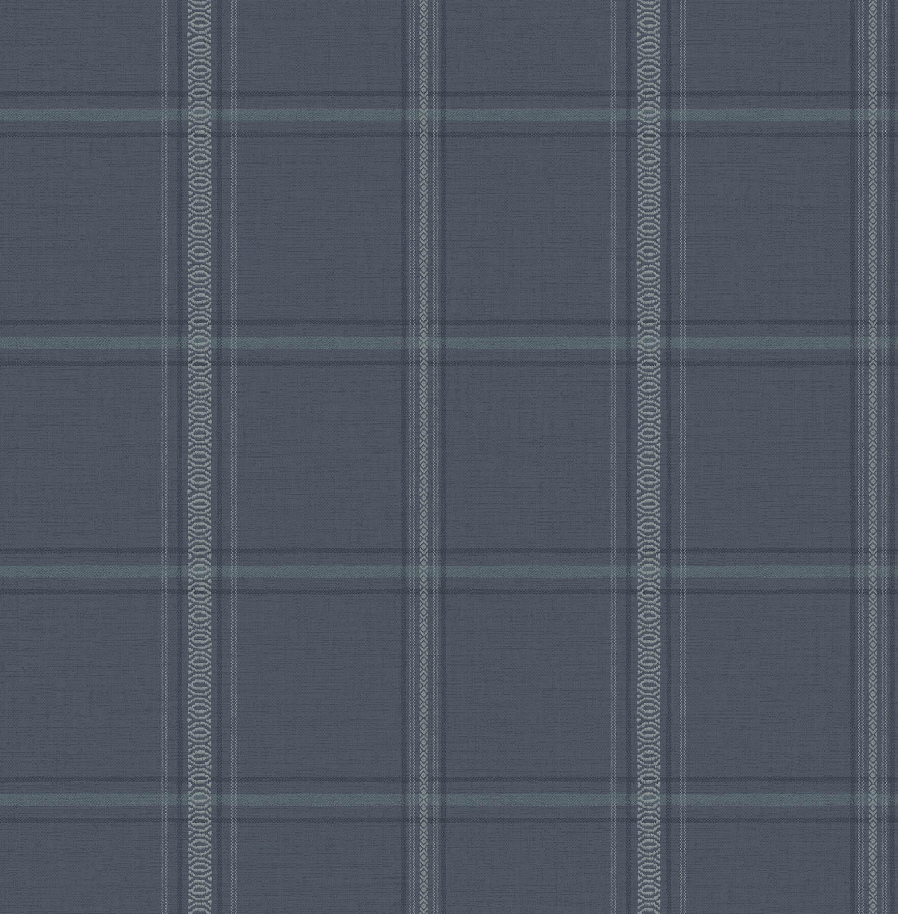 This embellished windowpane plaid wallpaper features vertical columns that alternate between narrow and wide diamond pattern detailing. Featured here in dark blue accented by aqua, pale blue, and navy. Auberge is an unpasted, non woven wallpaper measuring 20.5 inches wide by 33 feet long, covering approximately 56.4 square feet per roll. Oak & Moss Woodland Wonders by Chesapeake is a nature inspired wallpaper collection featuring whimsical botanicals, stylized forests, and charming woodland creatures. Soft watercolor palettes, linen textures, and classic patterns like florals, damasks, stripes, and faux grasscloth create a cozy, elevated look perfect for bedrooms, living rooms, and accent walls.