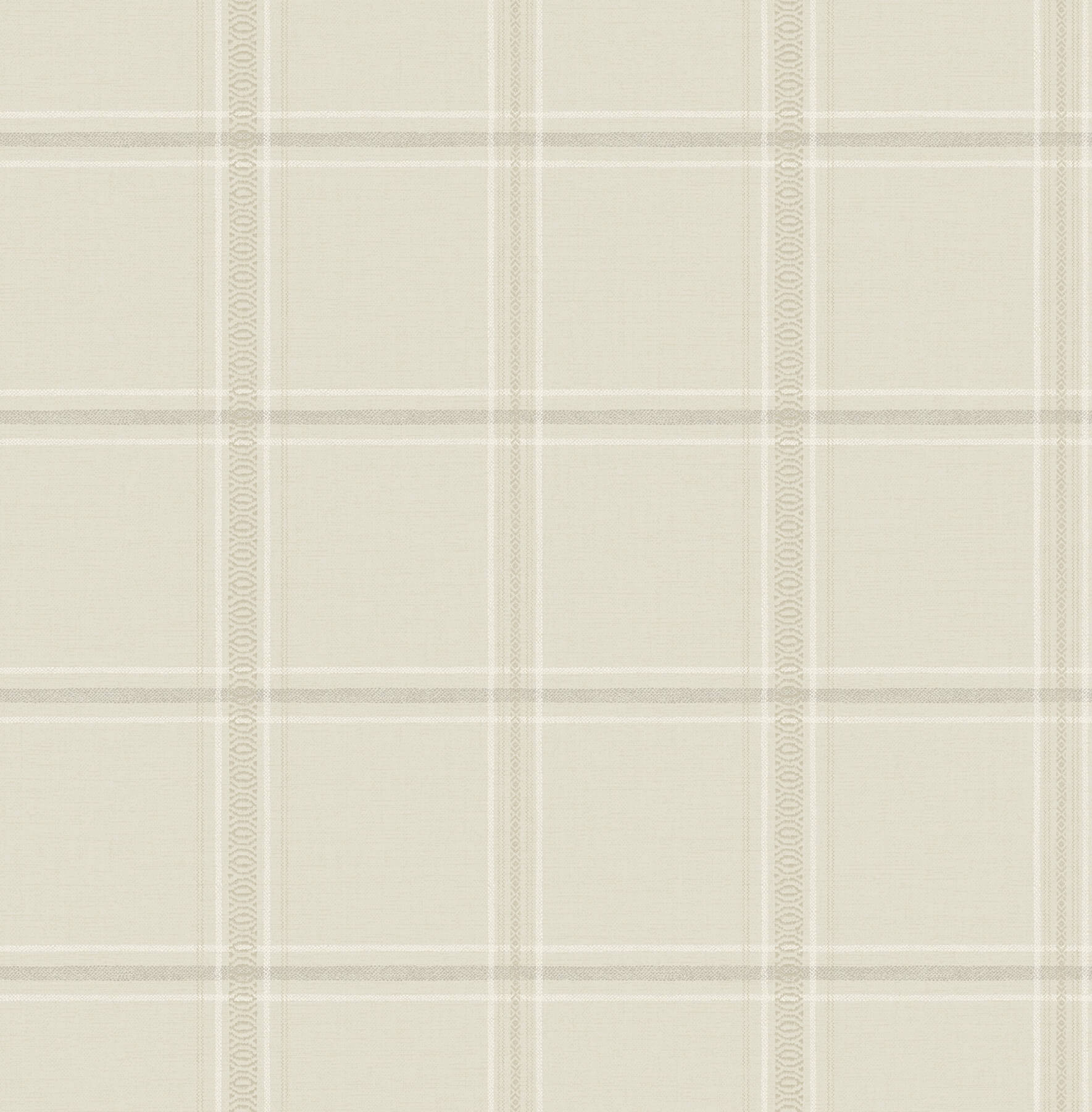 This embellished windowpane plaid wallpaper features vertical columns that alternate between narrow and wide diamond pattern detailing. Featured here in warm ivory accented by beige, grey, and white. Auberge is an unpasted, non woven wallpaper measuring 20.5 inches wide by 33 feet long, covering approximately 56.4 square feet per roll. Oak & Moss Woodland Wonders by Chesapeake is a nature inspired wallpaper collection featuring whimsical botanicals, stylized forests, and charming woodland creatures. Soft watercolor palettes, linen textures, and classic patterns like florals, damasks, stripes, and faux grasscloth create a cozy, elevated look perfect for bedrooms, living rooms, and accent walls.