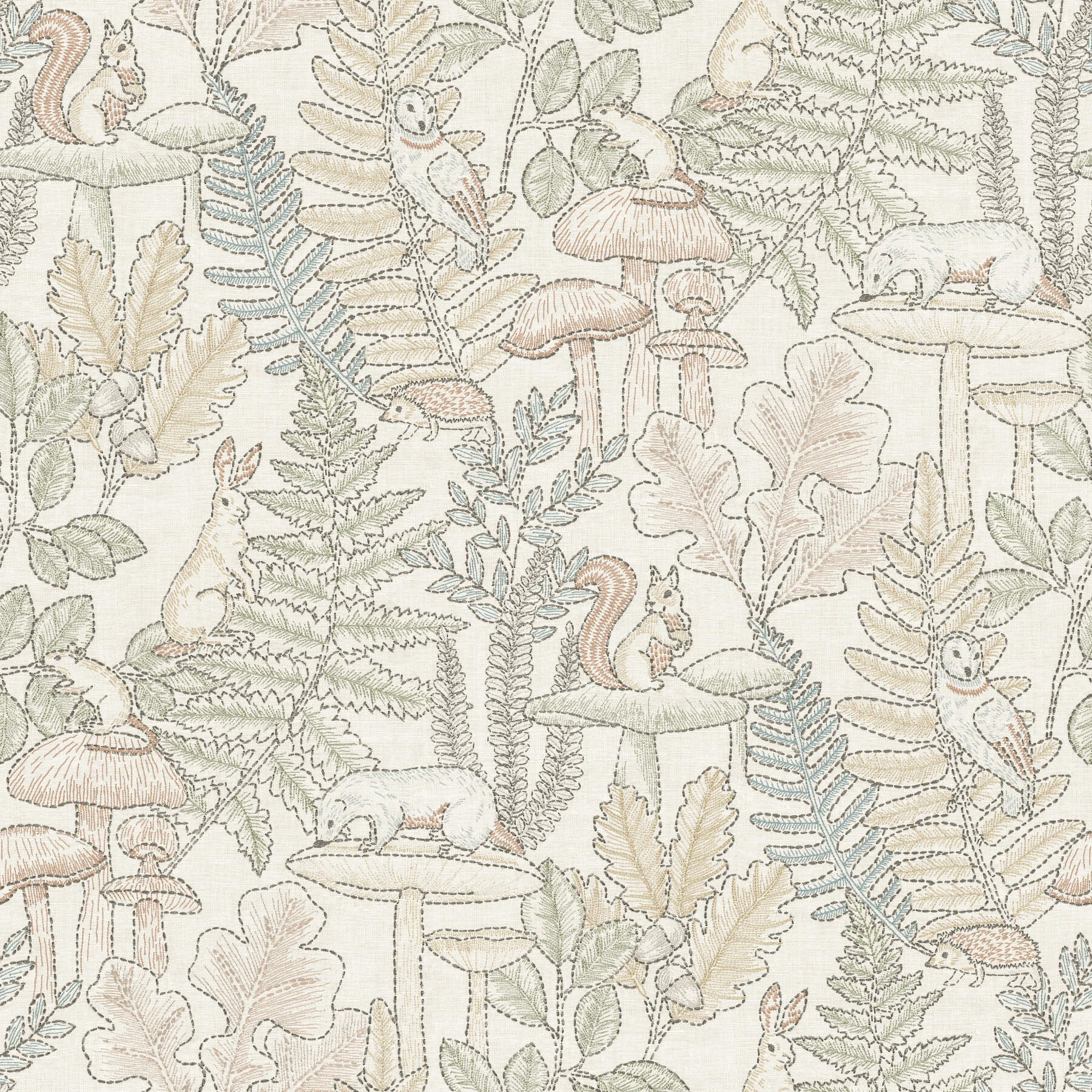 The creatures of the forest have come out to play amongst large-scale foliage and fungi, the details of both flora and fauna designed to imitate intricate embroidery. Featured here in a palette of ochre, light brown, salmon, sage, light blue, and teal against a cream backdrop imbued with linen detailing. Holt is a prepasted, surestrip wallpaper measuring 20.5 inches wide by 33 feet long, covering approximately 56.4 square feet per roll. Oak & Moss Woodland Wonders by Chesapeake is a nature inspired wallpaper collection featuring whimsical botanicals, stylized forests, and charming woodland creatures. Soft watercolor palettes, linen textures, and classic patterns like florals, damasks, stripes, and faux grasscloth create a cozy, elevated look perfect for bedrooms, living rooms, and accent walls.