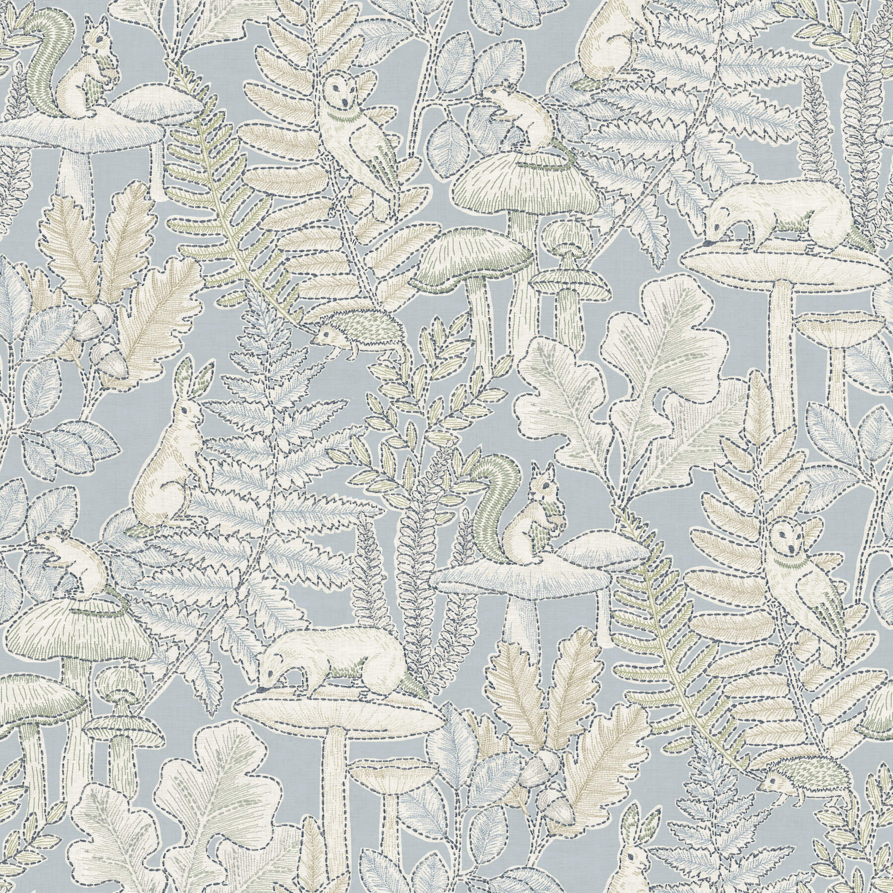 The creatures of the forest have come out to play amongst large-scale foliage and fungi, the details of both flora and fauna designed to imitate intricate embroidery. Featured here in a palette of pale brown, muted aqua, spring green, navy, and light blue against a sky blue backdrop imbued with linen detailing. Holt is a prepasted, surestrip wallpaper measuring 20.5 inches wide by 33 feet long, covering approximately 56.4 square feet per roll. Oak & Moss Woodland Wonders by Chesapeake is a nature inspired wallpaper collection featuring whimsical botanicals, stylized forests, and charming woodland creatures. Soft watercolor palettes, linen textures, and classic patterns like florals, damasks, stripes, and faux grasscloth create a cozy, elevated look perfect for bedrooms, living rooms, and accent walls.