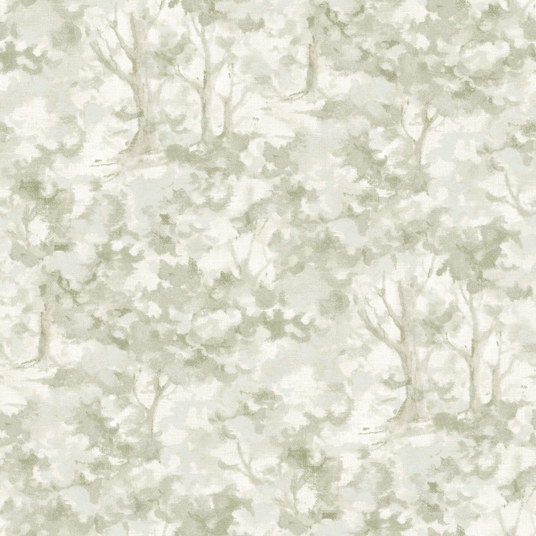This stylized forest wallpaper highlights the dense, cloud-like foliage of ancient oak trees. Seen here in a palette of soft greens, pale blue, beige, and cream. Thicket is a prepasted, surestrip wallpaper measuring 20.5 inches wide by 33 feet long, covering approximately 56.4 square feet per roll. Oak & Moss Woodland Wonders by Chesapeake is a nature inspired wallpaper collection featuring whimsical botanicals, stylized forests, and charming woodland creatures. Soft watercolor palettes, linen textures, and classic patterns like florals, damasks, stripes, and faux grasscloth create a cozy, elevated look perfect for bedrooms, living rooms, and accent walls.