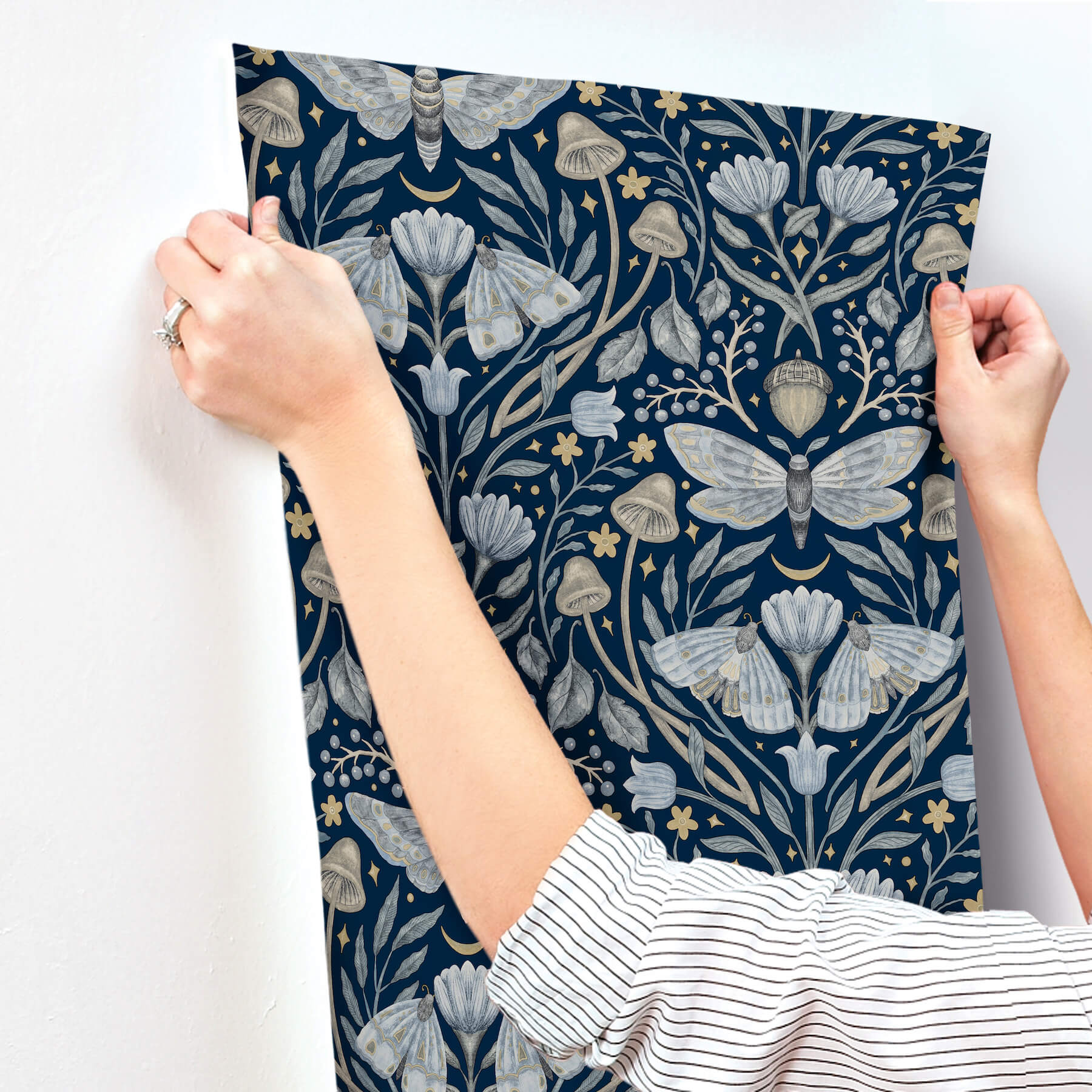 Bring enchantment to your home with this magical woodland damask featuring velveteen moths framed by twining leaves, mushrooms, wildflowers, berries, and acorns. Featured here in a rich palette of light blue, denim, ochre, taupe, charcoal, and cream against navy. Mystic Moth is a prepasted, surestrip wallpaper measuring 20.5 inches wide by 33 feet long, covering approximately 56.4 square feet per roll. Oak & Moss Woodland Wonders by Chesapeake is a nature inspired wallpaper collection featuring whimsical botanicals, stylized forests, and charming woodland creatures. Soft watercolor palettes, linen textures, and classic patterns like florals, damasks, stripes, and faux grasscloth create a cozy, elevated look perfect for bedrooms, living rooms, and accent walls.