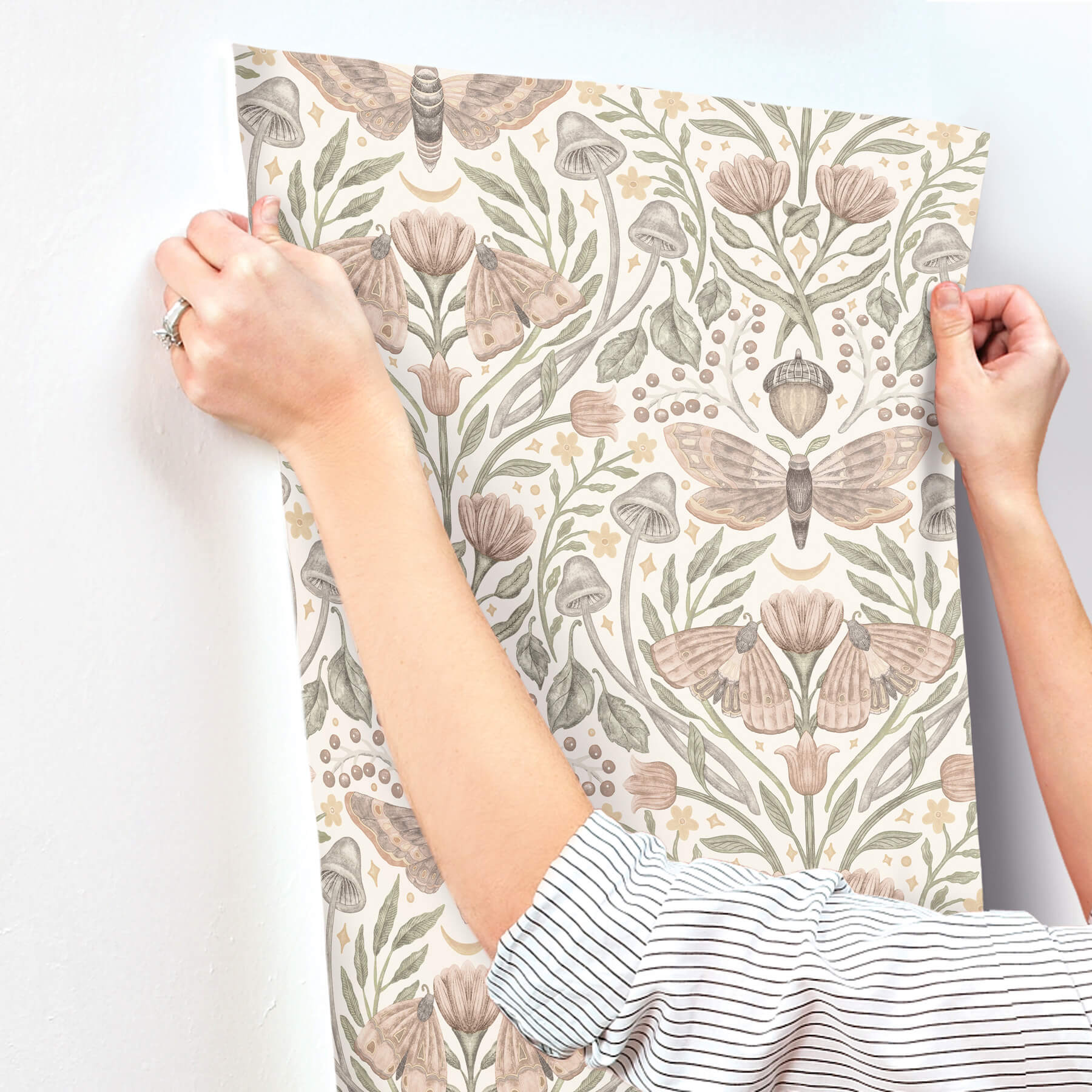 Bring enchantment to your home with this magical woodland damask featuring velveteen moths framed by twining leaves, mushrooms, wildflowers, berries, and acorns. Featured here in a soothing palette of blush, sage, butter yellow, mauve, and grey against white. Mystic Moth is a prepasted, surestrip wallpaper measuring 20.5 inches wide by 33 feet long, covering approximately 56.4 square feet per roll. Oak & Moss Woodland Wonders by Chesapeake is a nature inspired wallpaper collection featuring whimsical botanicals, stylized forests, and charming woodland creatures. Soft watercolor palettes, linen textures, and classic patterns like florals, damasks, stripes, and faux grasscloth create a cozy, elevated look perfect for bedrooms, living rooms, and accent walls.