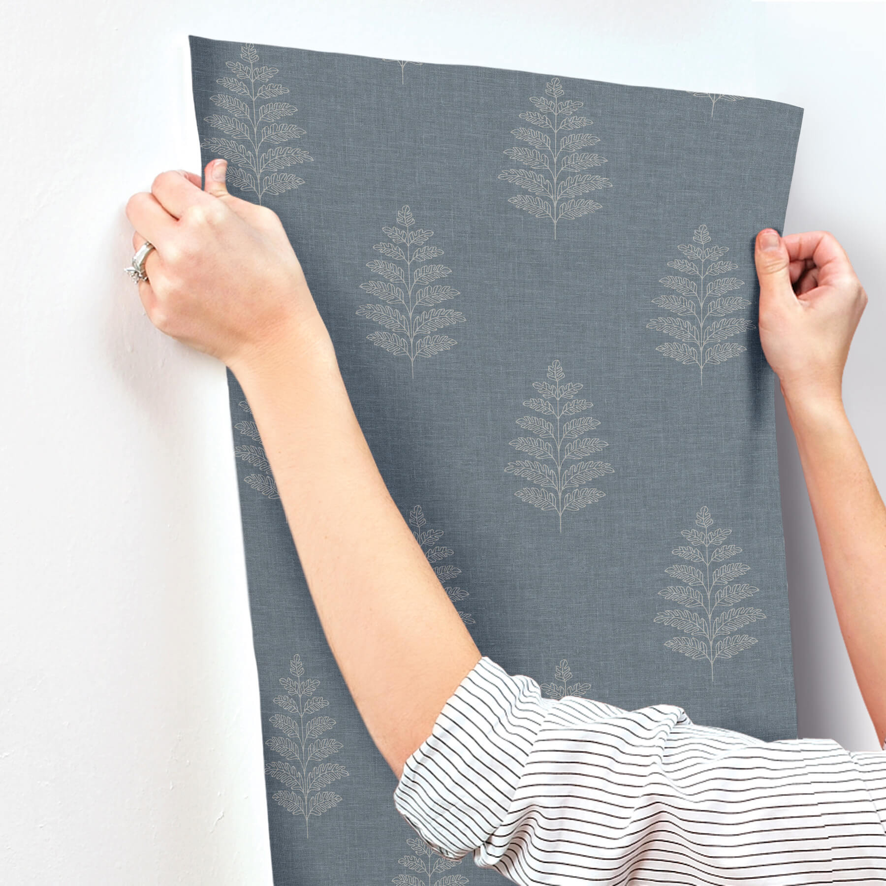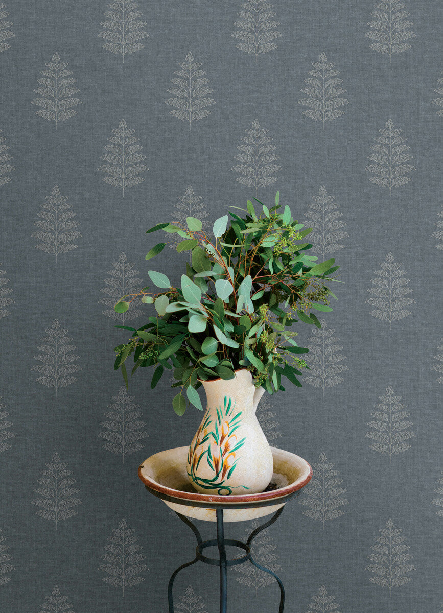 Delicate pale blue outlines of ferns etched along a denim blue, linen-detailed backdrop offer simple yet rich woodland elegance. Frond is a prepasted, surestrip wallpaper measuring 20.5 inches wide by 33 feet long, covering approximately 56.4 square feet per roll. Oak & Moss Woodland Wonders by Chesapeake is a nature inspired wallpaper collection featuring whimsical botanicals, stylized forests, and charming woodland creatures. Soft watercolor palettes, linen textures, and classic patterns like florals, damasks, stripes, and faux grasscloth create a cozy, elevated look perfect for bedrooms, living rooms, and accent walls.