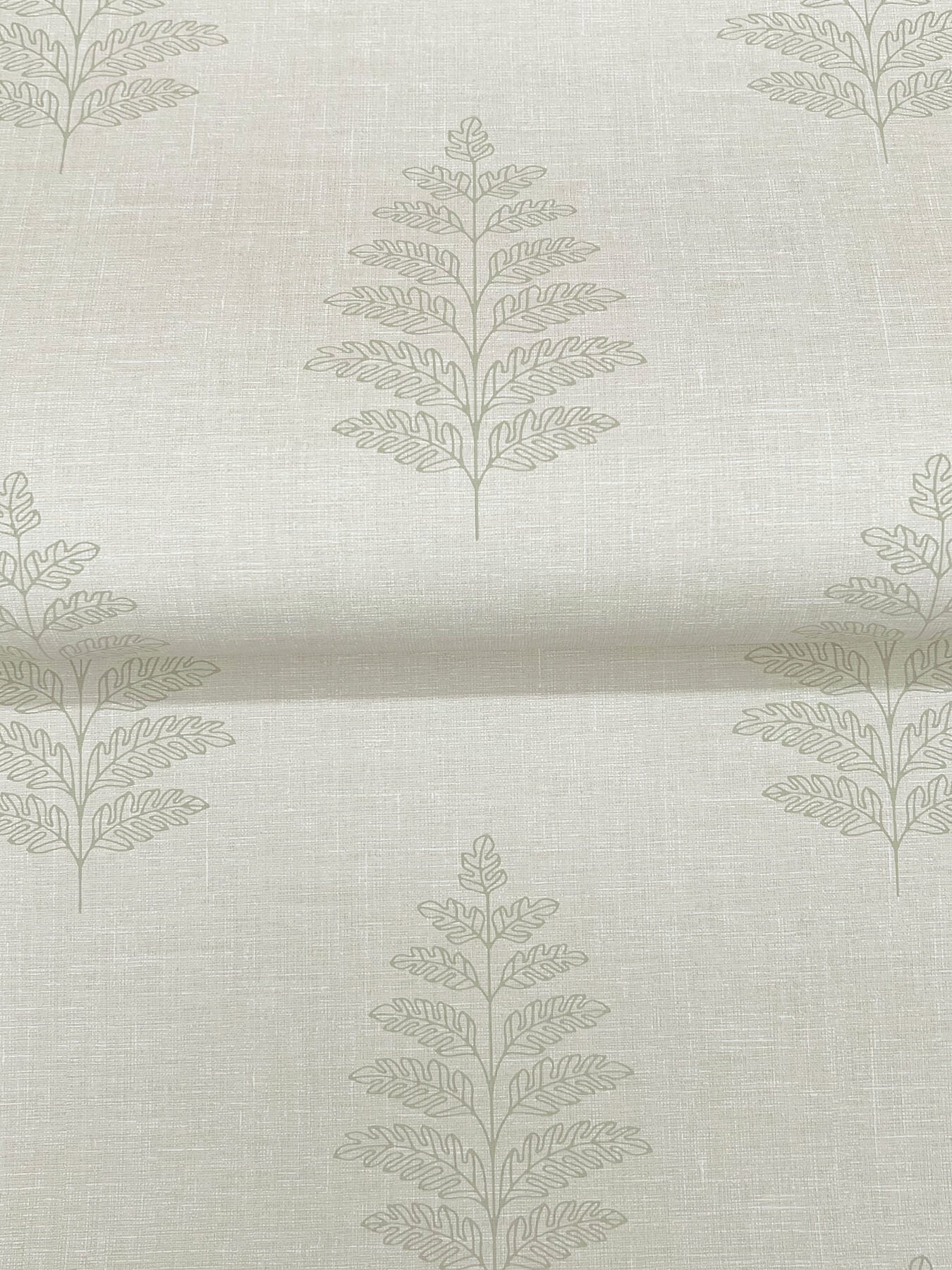 Delicate sage outlines of ferns etched along a beige, linen-detailed backdrop offer simple yet rich woodland elegance. Frond is a prepasted, surestrip wallpaper measuring 20.5 inches wide by 33 feet long, covering approximately 56.4 square feet per roll. Oak & Moss Woodland Wonders by Chesapeake is a nature inspired wallpaper collection featuring whimsical botanicals, stylized forests, and charming woodland creatures. Soft watercolor palettes, linen textures, and classic patterns like florals, damasks, stripes, and faux grasscloth create a cozy, elevated look perfect for bedrooms, living rooms, and accent walls.