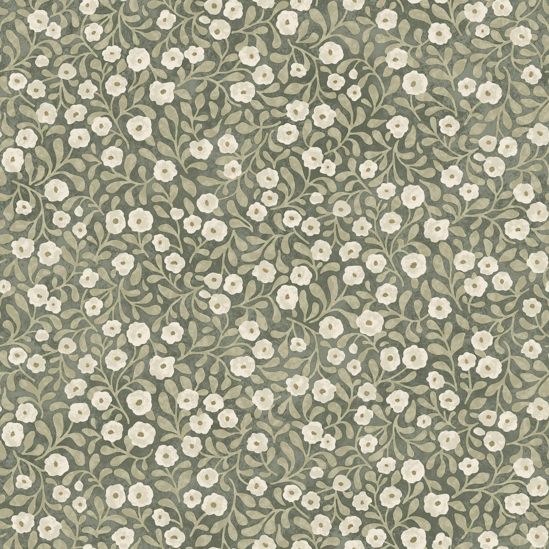 Dense clusters of petite poppies offer rich charm with their playful, abstracted styling. Seen here with white and beige flowers with golden centers and light green greenery against a dappled green backdrop. Poppy Trail is a prepasted, surestrip wallpaper measuring 20.5 inches wide by 33 feet long, covering approximately 56.4 square feet per roll. Oak & Moss Woodland Wonders by Chesapeake is a nature inspired wallpaper collection featuring whimsical botanicals, stylized forests, and charming woodland creatures. Soft watercolor palettes, linen textures, and classic patterns like florals, damasks, stripes, and faux grasscloth create a cozy, elevated look perfect for bedrooms, living rooms, and accent walls.
