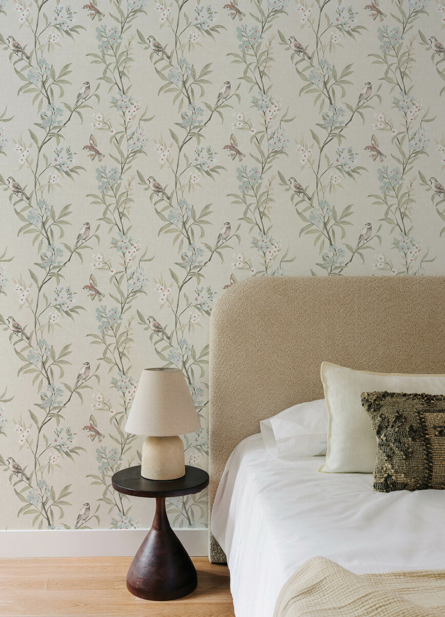Finches flutter to and explore tall, winding vines sporting cheerful flowers in this delightful design. Artistically rendered in sage, moss, taupe, rose, raspberry, light blue, and grey along a beige backdrop with brushstroke detailing. Tea Olive is a prepasted, surestrip wallpaper measuring 20.5 inches wide by 33 feet long, covering approximately 56.4 square feet per roll. Oak & Moss Woodland Wonders by Chesapeake is a nature inspired wallpaper collection featuring whimsical botanicals, stylized forests, and charming woodland creatures. Soft watercolor palettes, linen textures, and classic patterns like florals, damasks, stripes, and faux grasscloth create a cozy, elevated look perfect for bedrooms, living rooms, and accent walls.