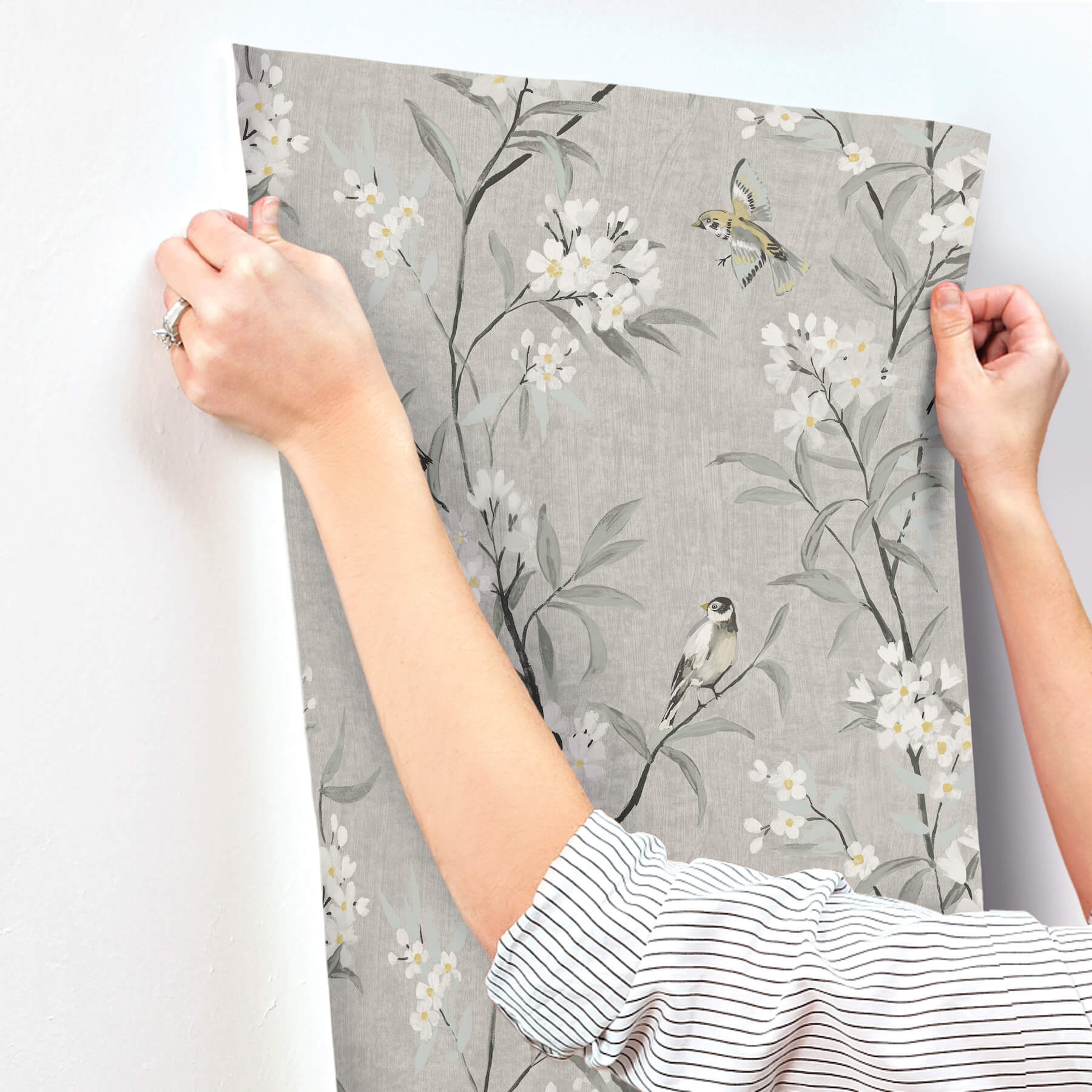 Finches flutter to and explore tall, winding vines sporting cheerful flowers in this delightful design. Artistically rendered in blue-grey, pale blue, mustard, white, pale grey, beige, and charcoal along a grey backdrop with brushstroke detailing. Tea Olive is a prepasted, surestrip wallpaper measuring 20.5 inches wide by 33 feet long, covering approximately 56.4 square feet per roll. Oak & Moss Woodland Wonders by Chesapeake is a nature inspired wallpaper collection featuring whimsical botanicals, stylized forests, and charming woodland creatures. Soft watercolor palettes, linen textures, and classic patterns like florals, damasks, stripes, and faux grasscloth create a cozy, elevated look perfect for bedrooms, living rooms, and accent walls.