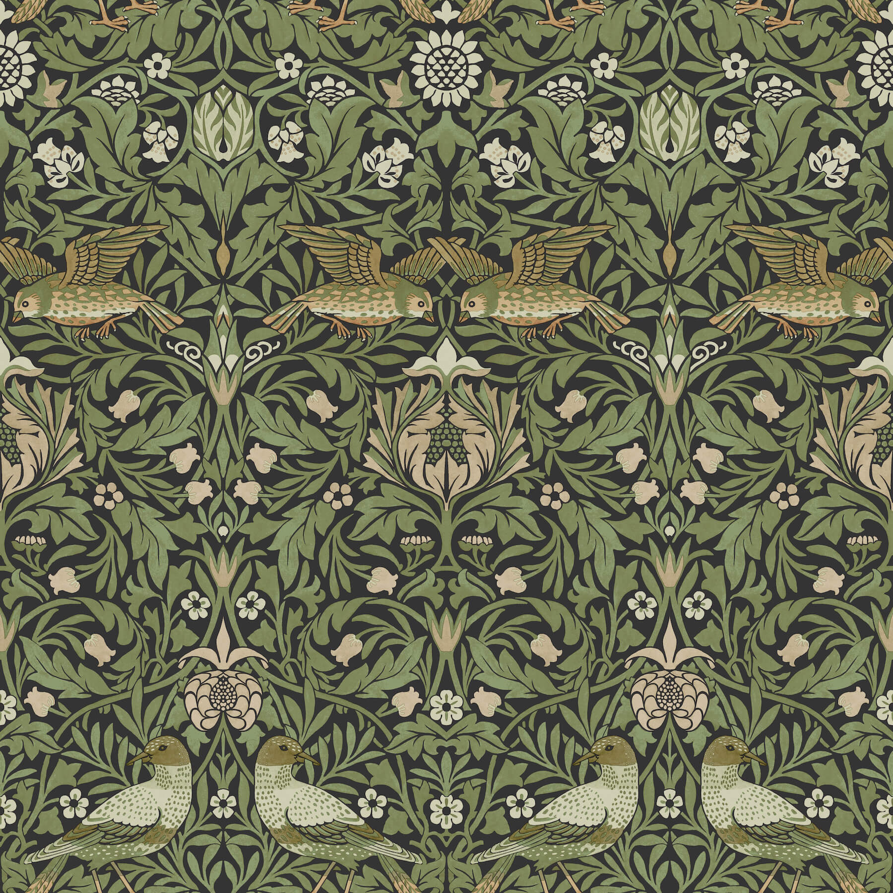 Inspired by a pattern Morris designed for the drawing room of his Kelmscott House, Bird features pairs of wood pigeons and thrushes perched within lush background foliage composed of sunflowers, bellflowers and stylized poppy heads. Featured here in a palette of green, lime, moss, ochre, cream, and black. Bird is an unpasted, non woven wallpaper measuring 20.9 inches wide by 33 feet long, covering approximately 57.5 square feet per roll. The William Morris Hidden Treasures Volume II collection by A-Street Prints re-imagines the legendary designs of William Morris with a fresh, contemporary touch. Inspired by the rich patterns and natural motifs of the Arts & Crafts movement, this collection brings timeless British heritage into today's homes with graceful florals, intricate botanicals, and flowing vines.