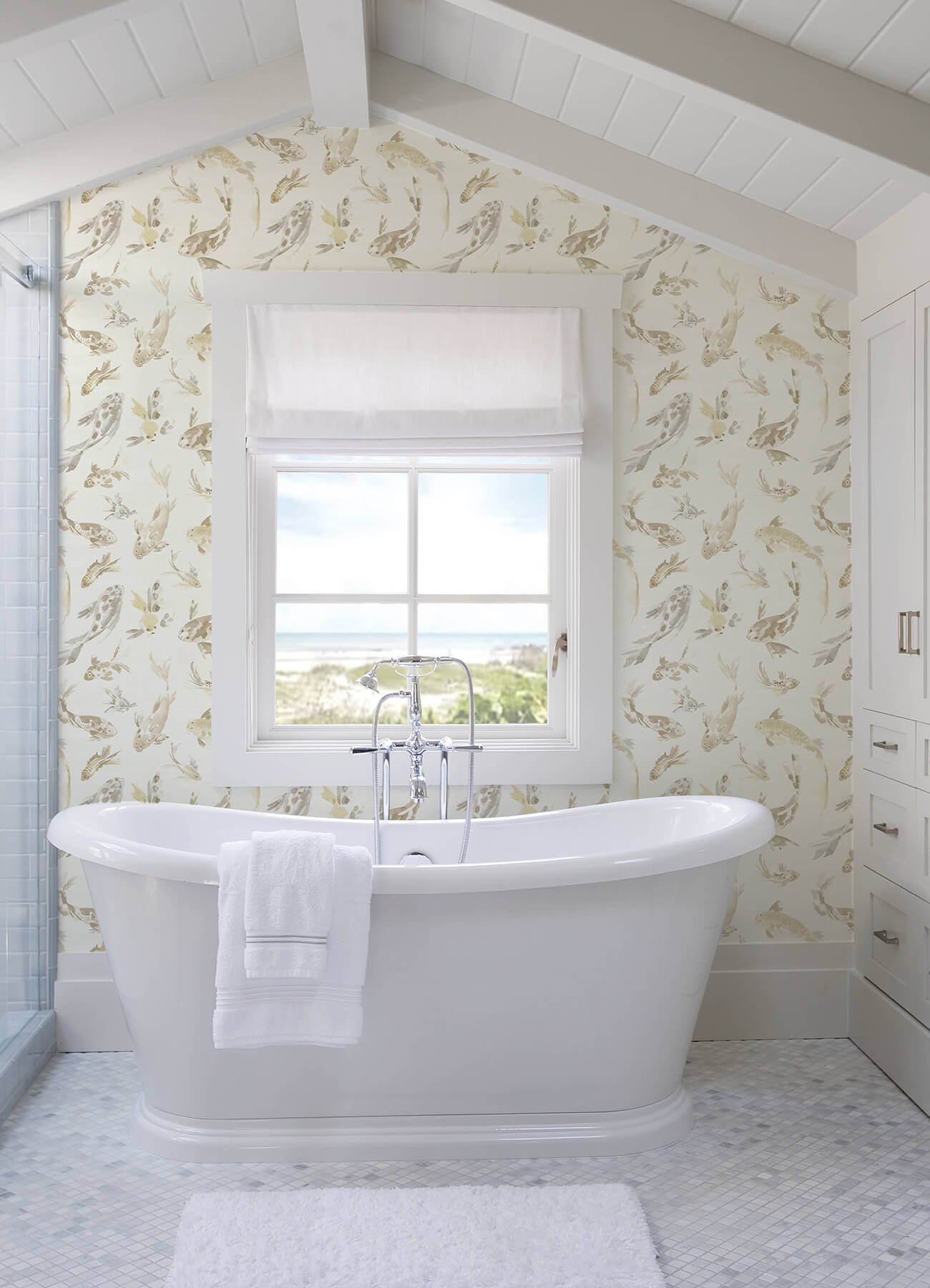Koi and goldfish swim in hypnotic circles, the design's flowing watercolors adding to its sense of movement and tranquility. Seen here in a warm palette of golden brown, sandy beige, bronze and pale grey accentuated by a pearlescent white backdrop and subtle raised inks. Koi is an unpasted, non woven wallpaper measuring 20.5 inches wide by 33 feet long, covering approximately 56.4 square feet per roll. Bring beachside serenity into your space with the Sea Salt collection by A-Street Prints. Inspired by the soothing ambiance of surf and sand, this unpasted wallpaper collection features tidal textures, coastal wildlife, and beachy botanicals in soft, airy color palettes. Designed to evoke the relaxed feel of seaside living, Sea Salt adds natural elegance to bedrooms, bathrooms, and beyond, perfect for creating a peaceful coastal retreat at home.