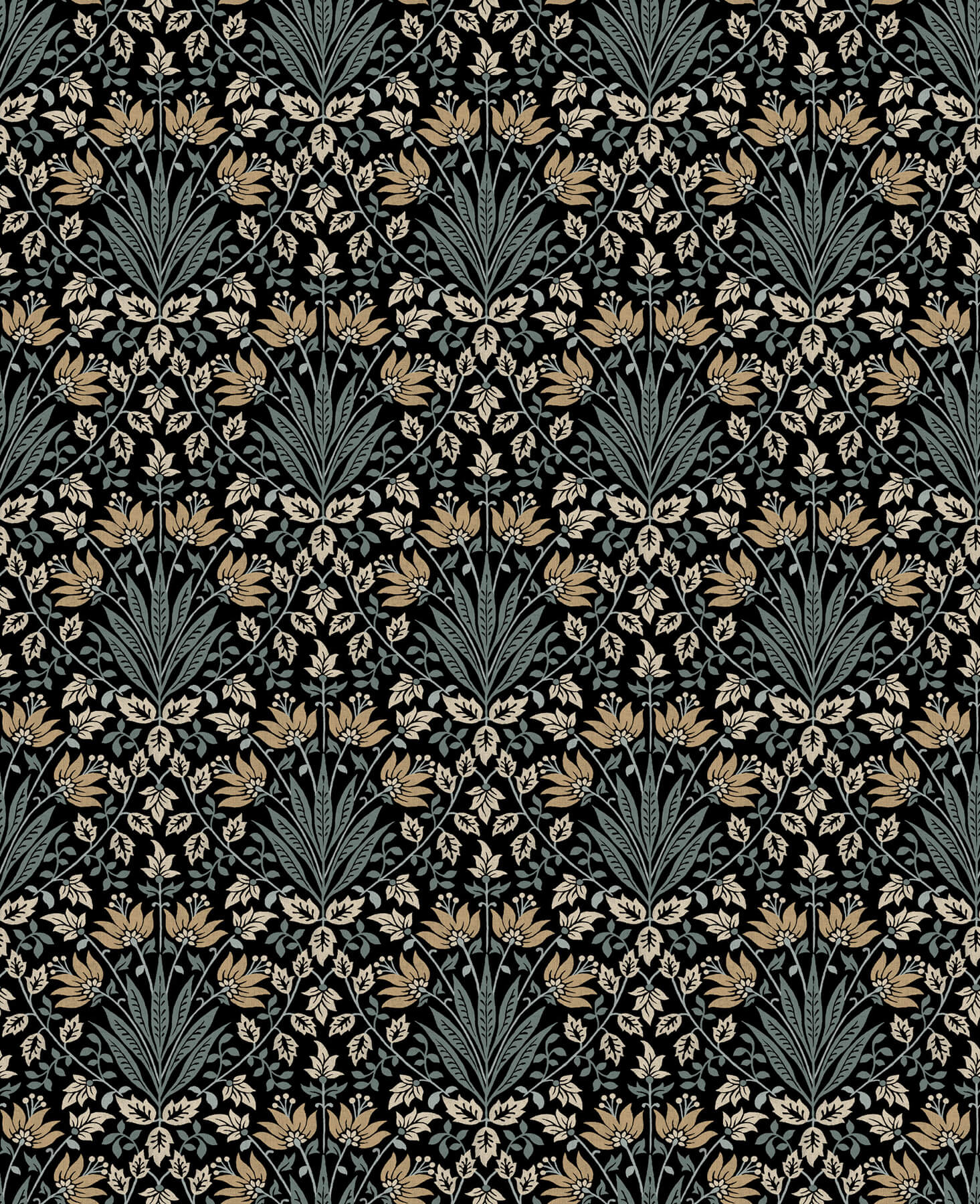 Inspired by the Arts & Crafts movement, this rich floral damask features groupings of tulips framed and connected by leafy vines. Featured here in a rich palette of black, ochre, weathered teal, and cream. Woodbury is an unpasted, non woven wallpaper measuring 20.5 inches wide by 33 feet long, covering approximately About 56.4 square feet square feet per roll. Bring timeless beauty into your home with The Storied Collection by Chris Loves Julia and A-Street Prints. This curated wallpaper line blends classic design with a modern twist - featuring traditional wallpapers in moody colors, bold botanicals, and elegant damasks that make every wall feel like a work of art.