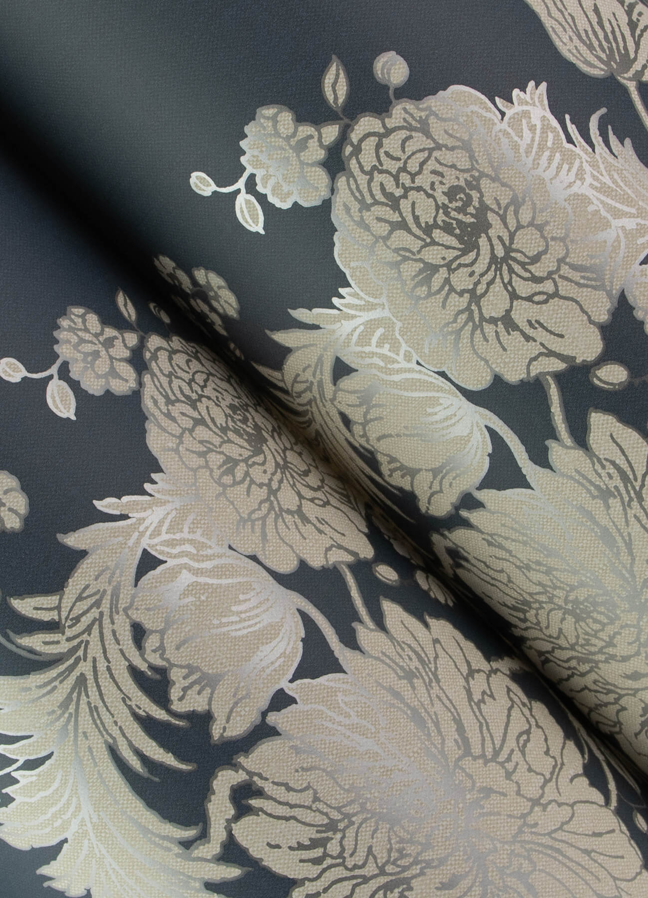 Feathery ferns twine together with voluminous blossoms to form curving columns rich in botanical beauty. The flora is inked in pale grey and metallic silver against a rich blue backdrop, the entire design enriched with linen's woven detailing. Gisela is an unpasted, non woven wallpaper measuring 20.5 inches wide by 33 feet long, covering approximately About 56.4 square feet square feet per roll. Bring timeless beauty into your home with The Storied Collection by Chris Loves Julia and A-Street Prints. This curated wallpaper line blends classic design with a modern twist - featuring traditional wallpapers in moody colors, bold botanicals, and elegant damasks that make every wall feel like a work of art.