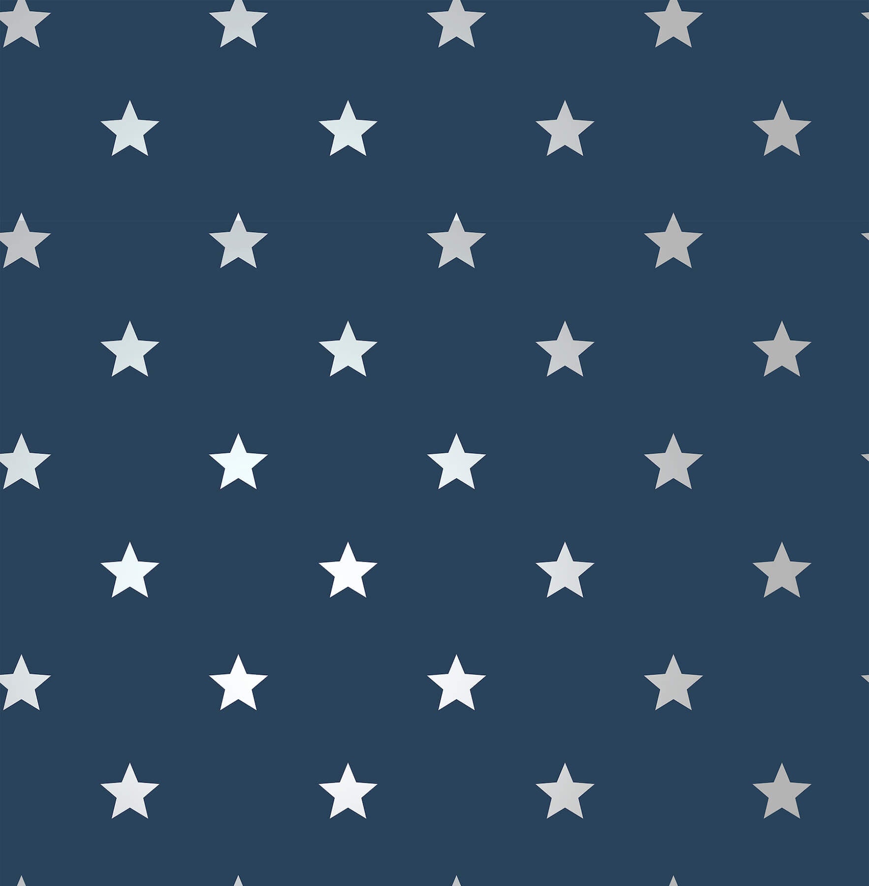 Starry Motif features classic five-point stars decorating a solid backdrop. Seen here with metallic silver stars against dark blue. Starry Motif is an unpasted, non woven wallpaper measuring 20.5 inches wide by 33 feet long, covering approximately 56.4 square feet per roll. This kids wallpaper collection features playful animals, stars, vehicles, rainbows, dinosaurs, and space themes to create a fun, imaginative room for any child.