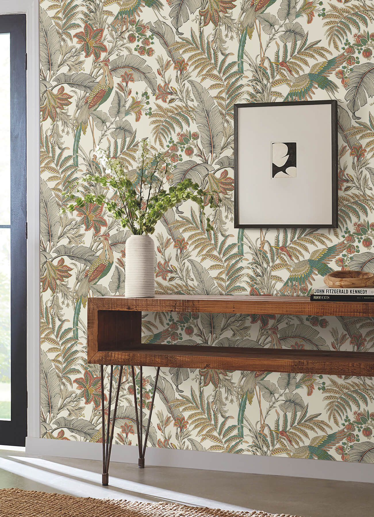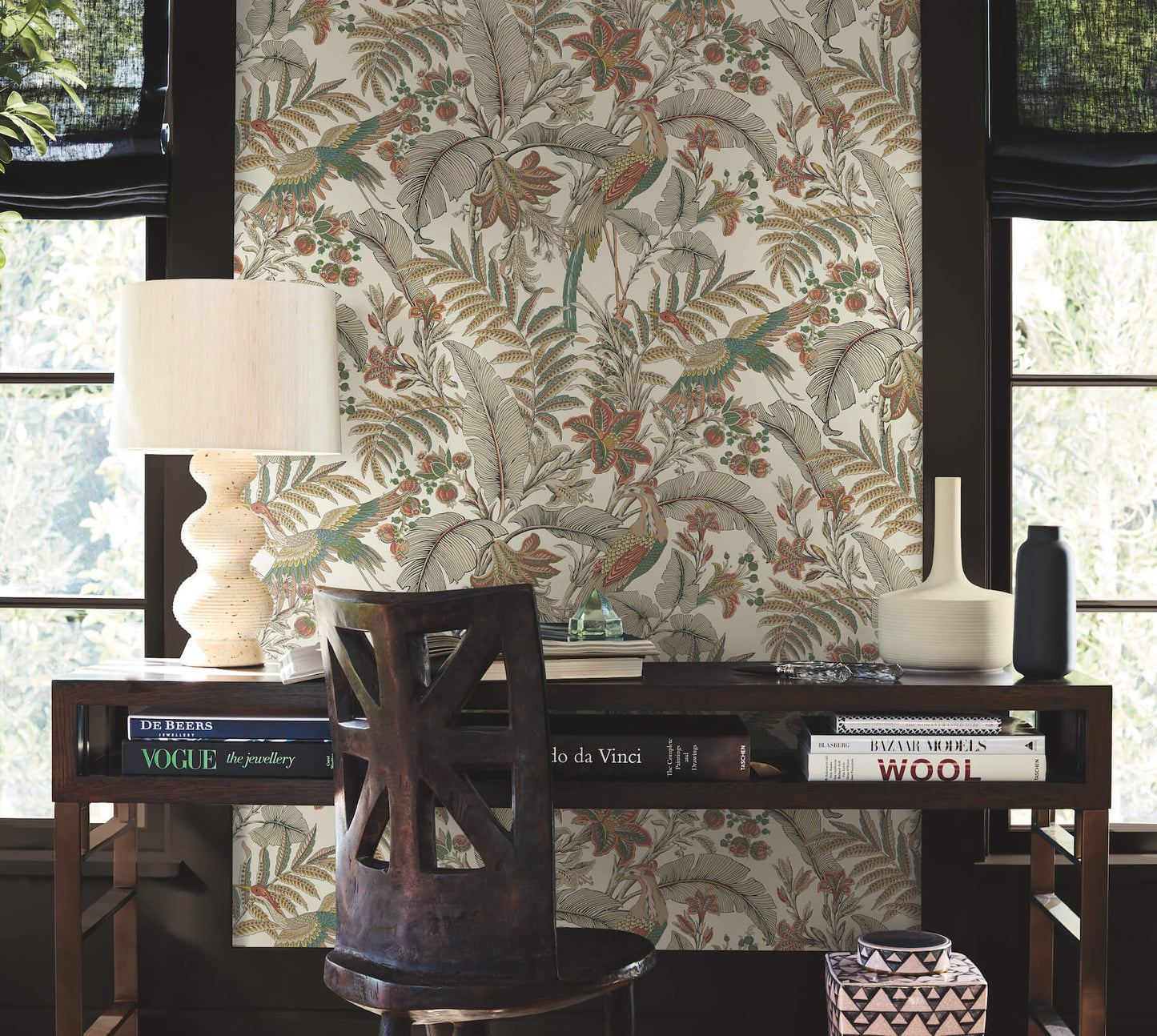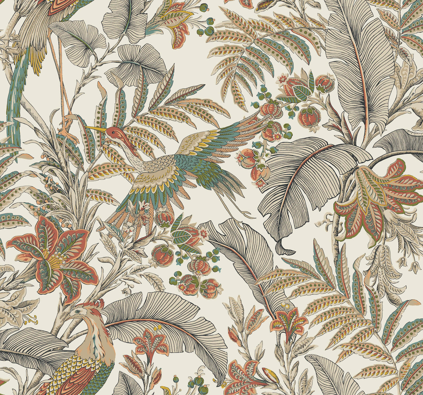 A lush array of richly illustrated flowers and fronds nearly hide the statuesque figures of these iconic wading birds in pattern Heronwood. Featured here in a palette of terracotta, persimmon, turquoise, moss, ochre, taupe, and alabaster. This Heronwood Wallpaper measures approximately 27 inches wide by 27 feet long, measuring approximately 60.8 square feet per roll. The rich global heritage of timeless relics and hand-crafted naturals are artfully blended in this curated collection of culturally inspired designs.