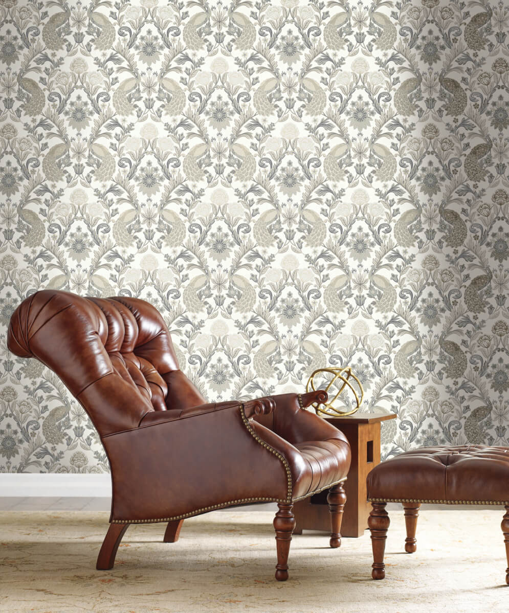 Plume Dynasty’s peacock and floral pattern is a sophisticated, modernized damask with a touch of metallic shimmer. This Ronald Redding collection of fine wallpaper is dedicated to the vision of the Arts and Crafts movement. Featuring designs inspired by archival and original art created by design pioneer C.F.A. Voysey, these patterns exemplify the concepts of simplicity, craftsmanship, and the use of natural materials, which continue their impact on every aspect of today's interiors.