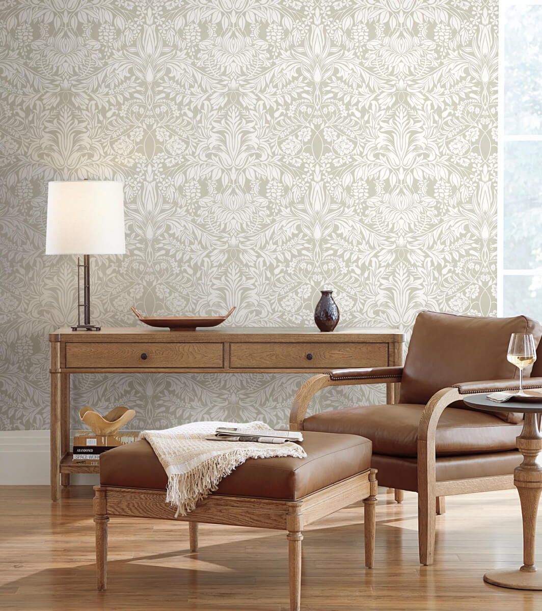 The rich tapestries of the Arts and Crafts design movement inspire the beautiful floral design of pattern Lockwood Damask. This Ronald Redding collection of fine wallpaper is dedicated to the vision of the Arts and Crafts movement. Featuring designs inspired by archival and original art created by design pioneer C.F.A. Voysey, these patterns exemplify the concepts of simplicity, craftsmanship, and the use of natural materials, which continue their impact on every aspect of today's interiors.