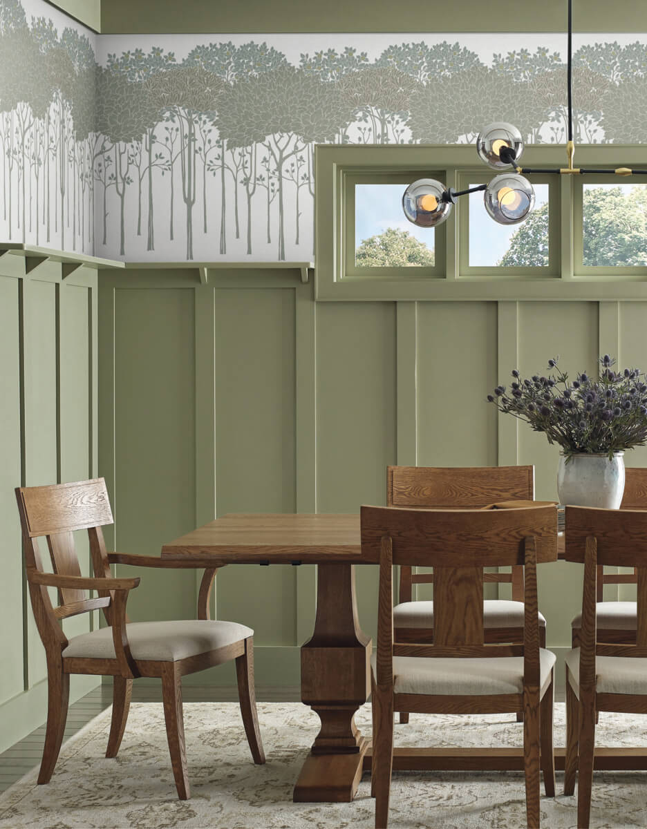 The wide wallpaper panels of the Arts and Crafts style, placed at ceiling height, inspire the forest scenic on metallic grounds of pattern Oakwood Grove. This Ronald Redding collection of fine wallpaper is dedicated to the vision of the Arts and Crafts movement. Featuring designs inspired by archival and original art created by design pioneer C.F.A. Voysey, these patterns exemplify the concepts of simplicity, craftsmanship, and the use of natural materials, which continue their impact on every aspect of today's interiors.