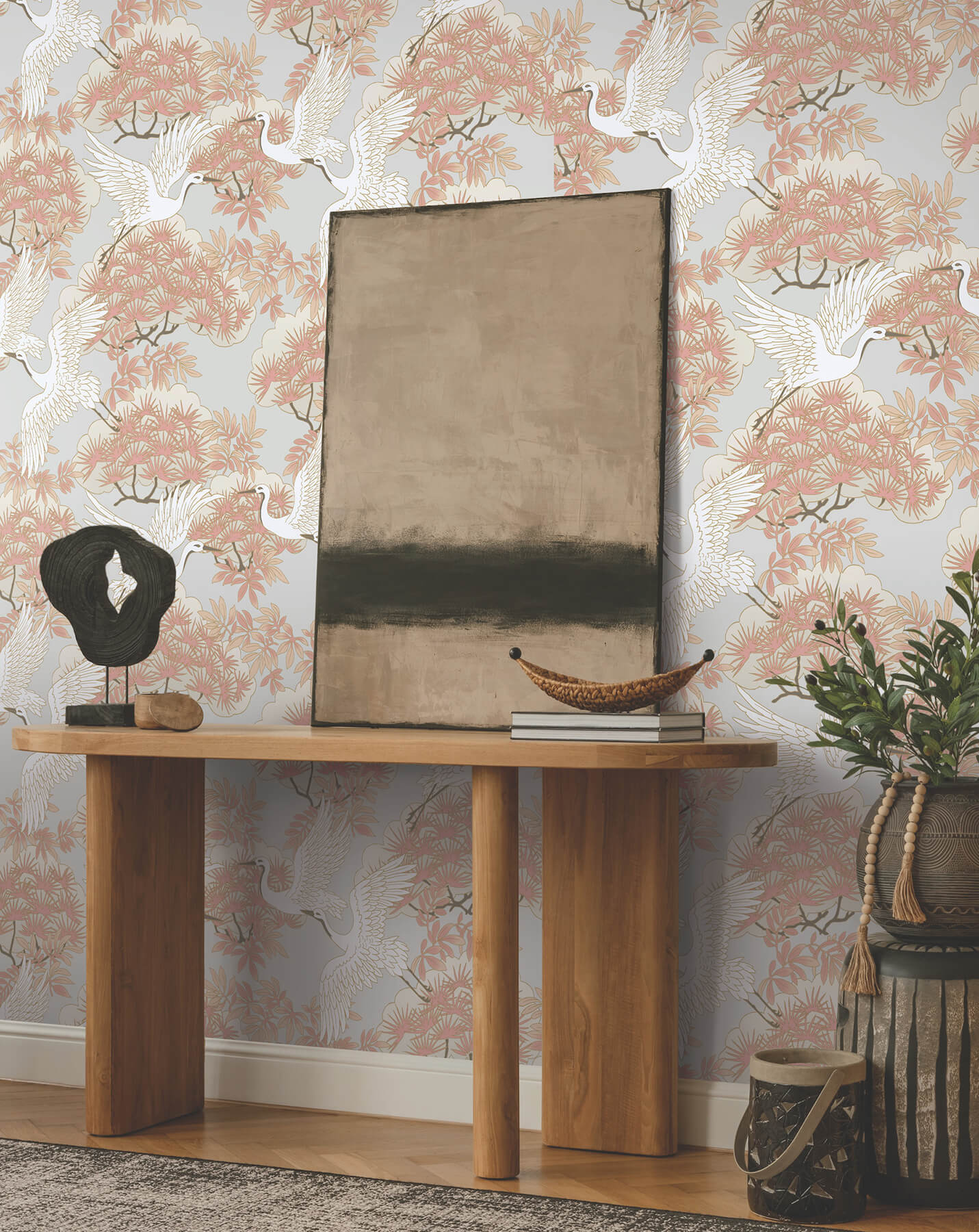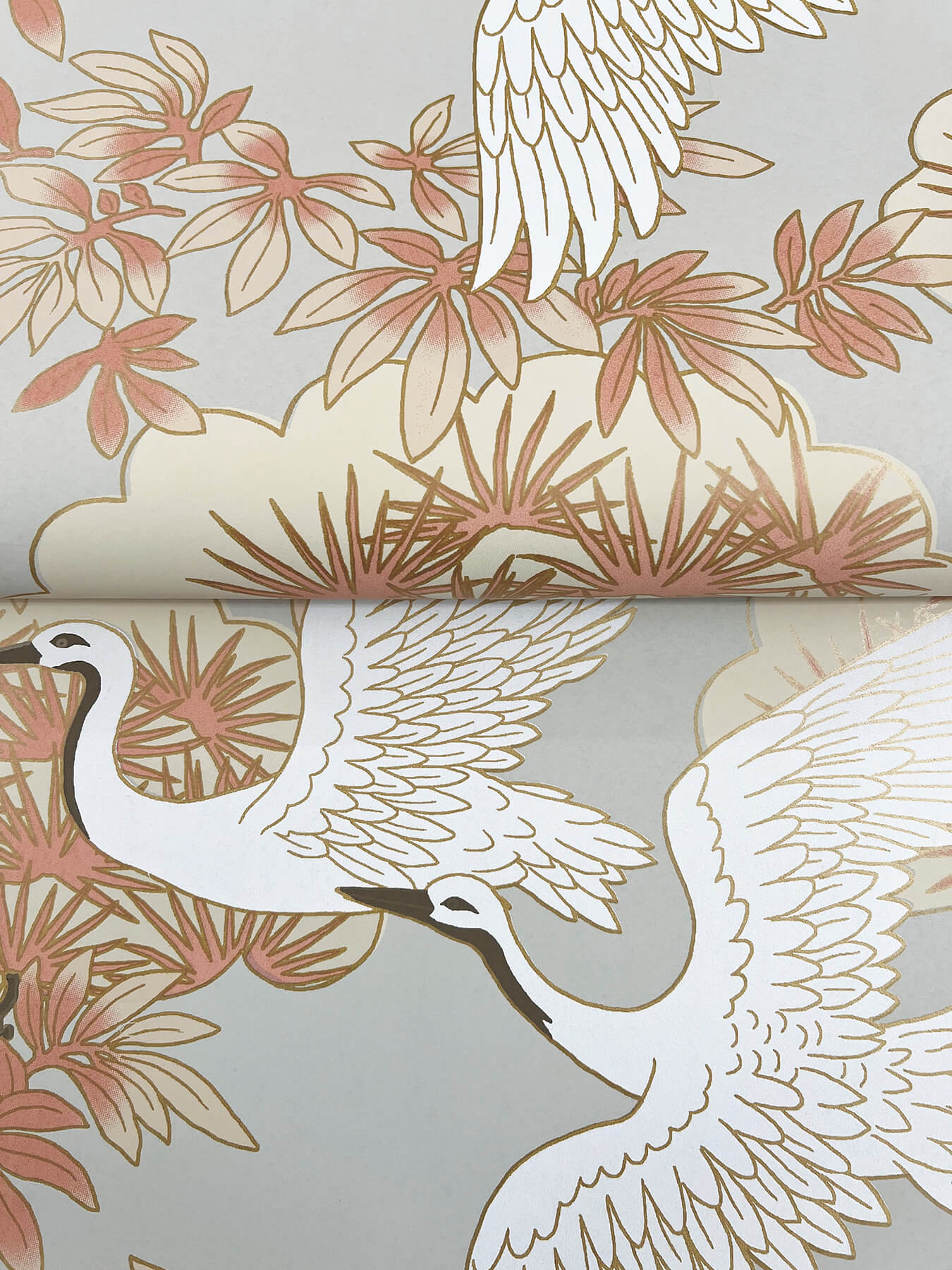 Sprig & Heron’s graceful birds lift their lustrous wings as they fly between beautiful, stylized bonsai trees, shown here in dove grey and coral with gold metallic. This Sprig & Heron Wallpaper measures approximately 27 inches wide by 27 feet long, measuring approximately 60.8 square feet per roll. The tea garden provides a meditative pathway from the outside world to inner tranquility. Experience the quiet luxury and uncompromising beauty within this second edition Tea Garden collection.