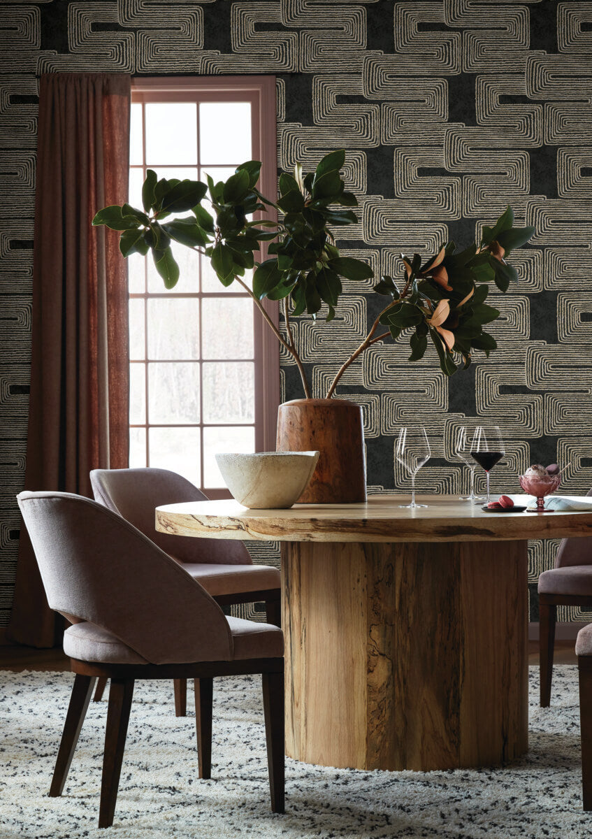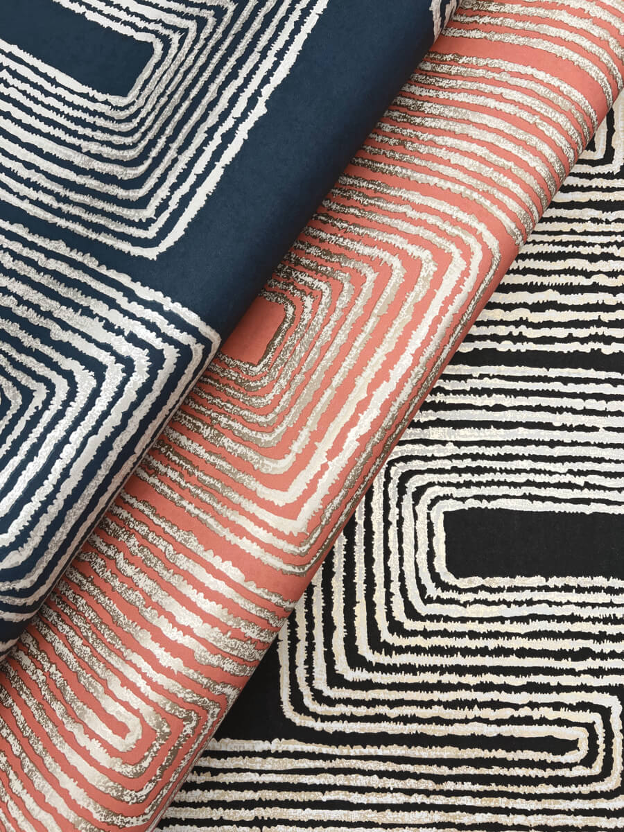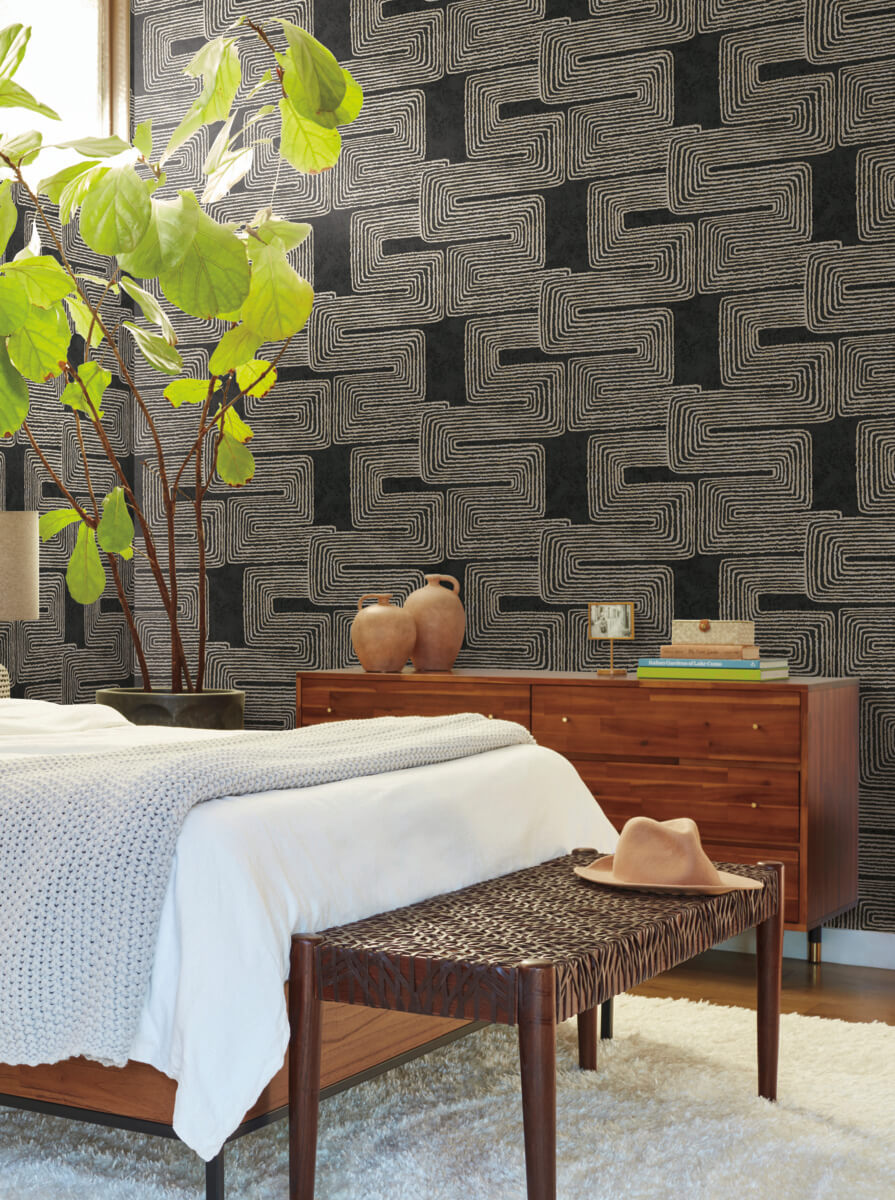 Winding layers of sinuous grey strands are embellished with textural detailing and a golden metallic finish in black Zulu Thread. This Zulu Thread Wallpaper measures approximately 27 inches wide by 27 feet long, measuring approximately 60.8 square feet per roll. Artistic experimentation with the interplay of form, color and texture has led to an avant-garde reimagining of familiar design motifs. Artistic experimentation with the interplay of form, color and texture has led to an avant garde reimagining of familiar design motifs in the Artistic Abstracts wallpaper collection by York Wallcoverings.