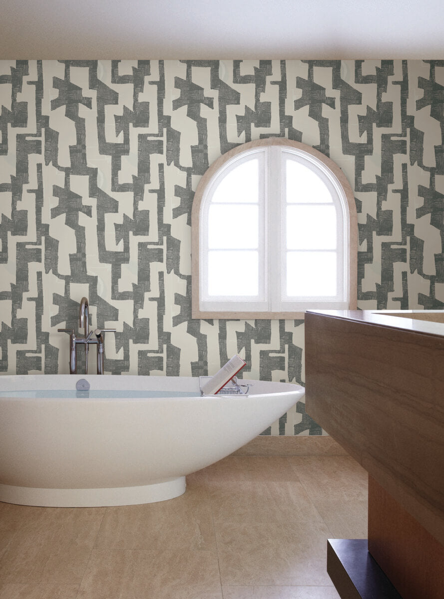 A subtle swirled taupe backdrop receives bold stamping with Modern Tribal's intricately patterned and iridescent charcoal geometrics. This Modern Tribal Wallpaper measures approximately 27 inches wide by 27 feet long, measuring approximately 60.8 square feet per roll. Artistic experimentation with the interplay of form, color and texture has led to an avant-garde reimagining of familiar design motifs. Artistic experimentation with the interplay of form, color and texture has led to an avant garde reimagining of familiar design motifs in the Artistic Abstracts wallpaper collection by York Wallcoverings.