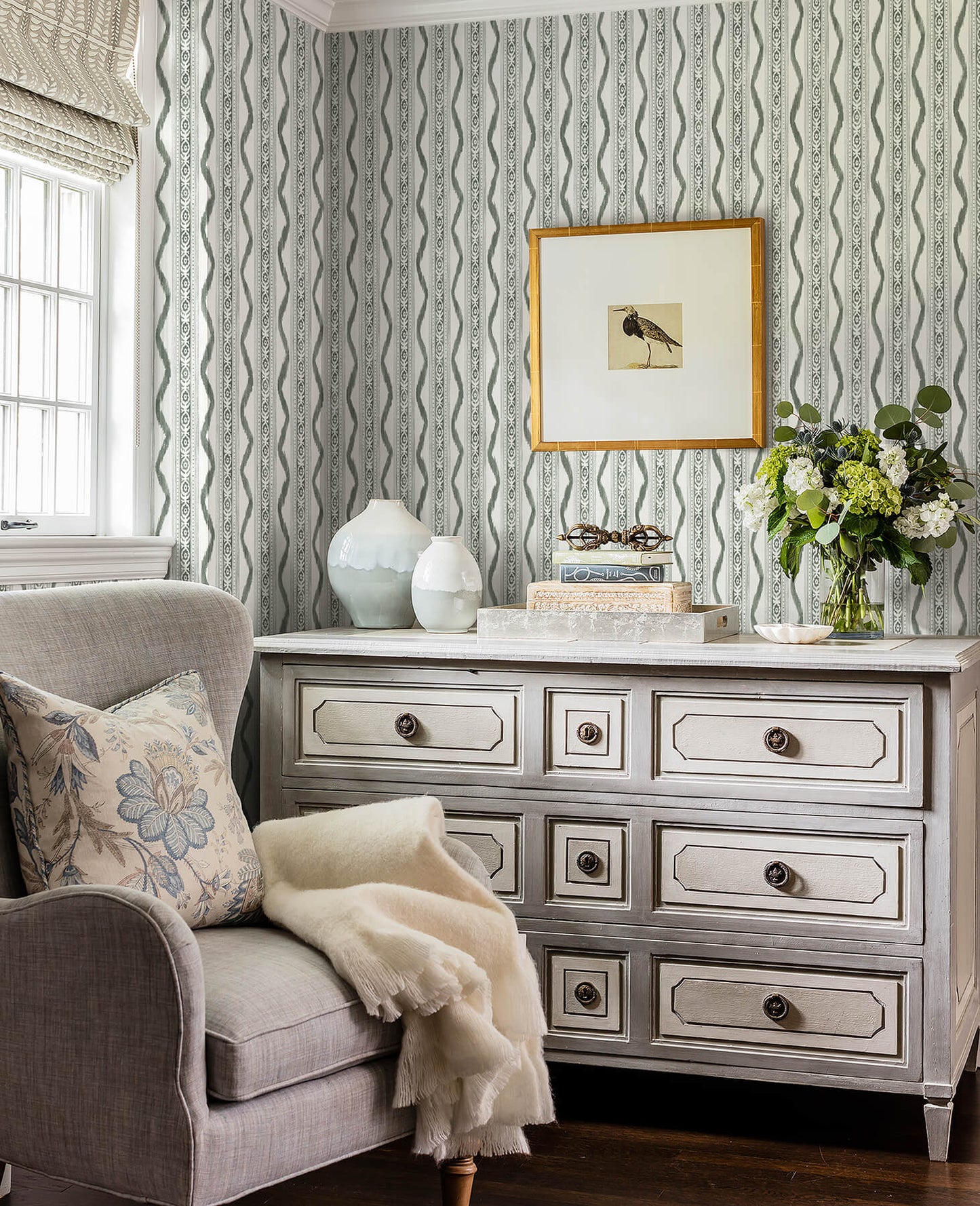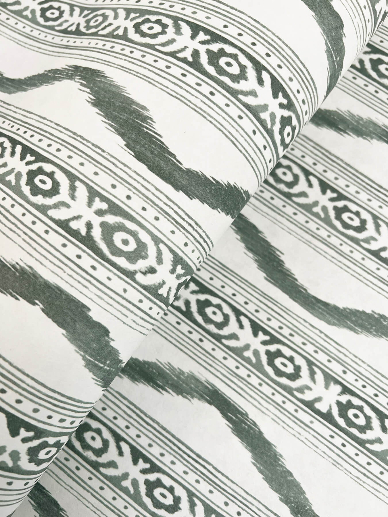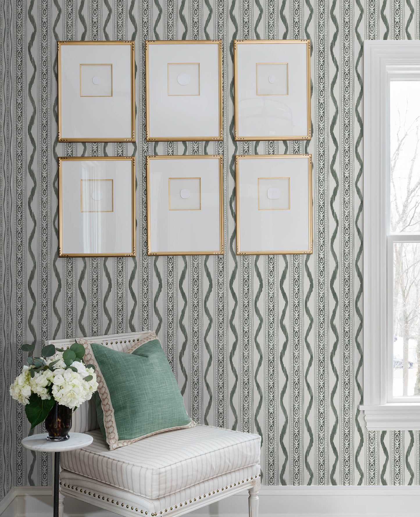 Enjoy a sophisticated update on a classic and designer-favorite design. This painterly wallpaper features stripes with intricate block-printed detailing, ikat ogee frame, and an earthy green hue. Artwork by Rachel Rogers. Rhys is an unpasted, non woven wallpaper. Explore Erin Gates stunning wallpaper collection, blending timeless floral and chic geometric patterns. Re-imagined for modern homes, this collection reflects the New York Times bestselling author's passion for pattern and color.