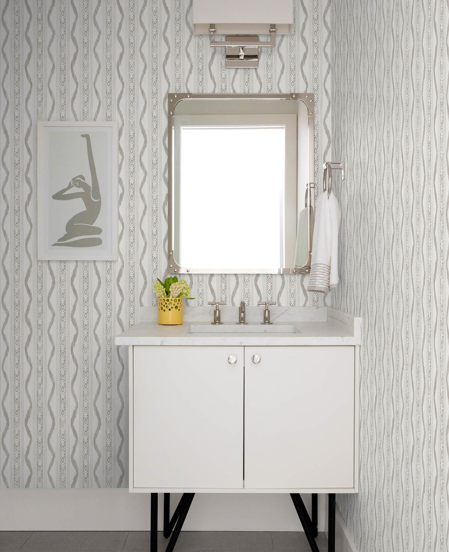 The artistic touches of this striped design add sophistication and depth to your interiors. The geometric stamped stripe is framed by an ikat ogee wave, the delicate not-too-grey-not-too-beige coloring making it a perfect accent in any space. Artwork by Rachel Rogers. Rhys is an unpasted, non woven wallpaper. Explore Erin Gates stunning wallpaper collection, blending timeless floral and chic geometric patterns. Re-imagined for modern homes, this collection reflects the New York Times bestselling author's passion for pattern and color.