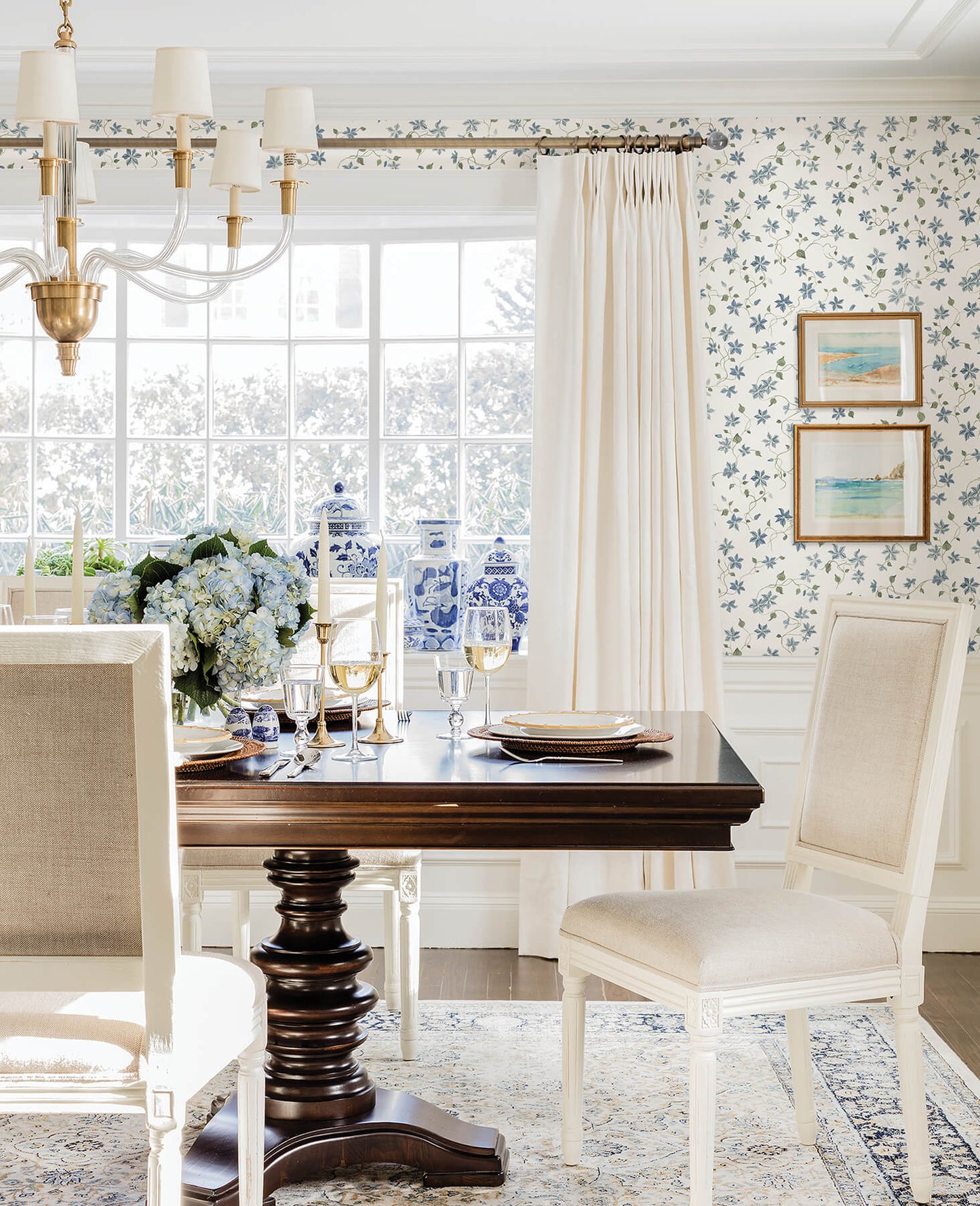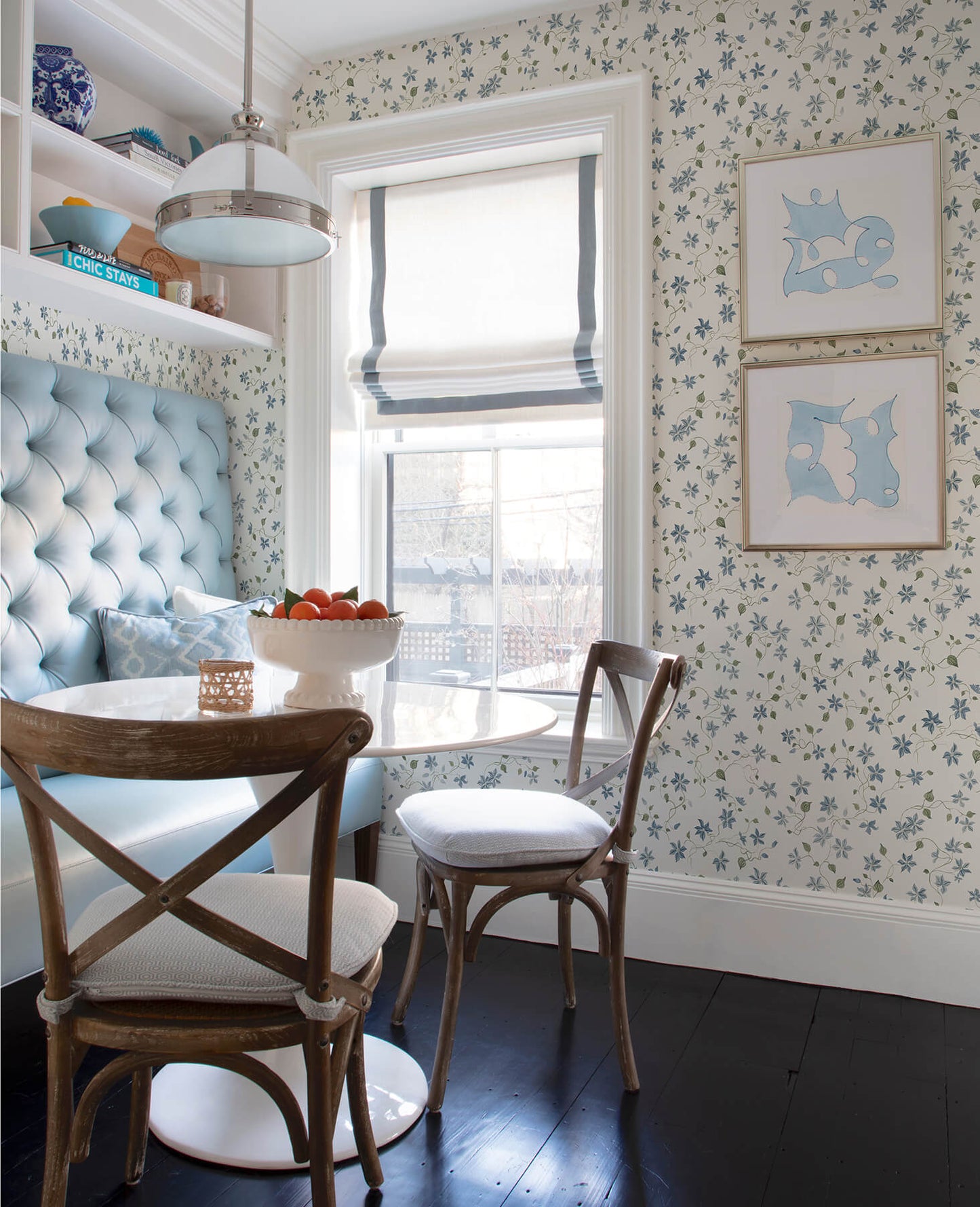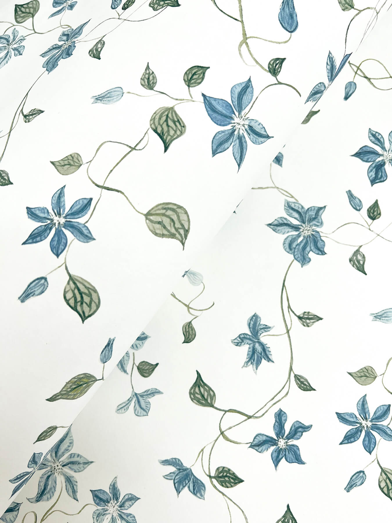This charming floral trail wallpaper is elevated by its painterly design. The blue blossoms and leaves of the winding vines are layered with delicate, watercolor detailing. Artwork by Rachel Rogers. Betsy is an unpasted, non woven wallpaper. Explore Erin Gates stunning wallpaper collection, blending timeless floral and chic geometric patterns. Re-imagined for modern homes, this collection reflects the New York Times bestselling author's passion for pattern and color.