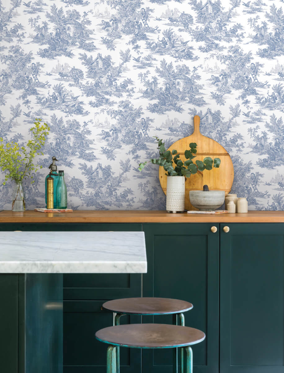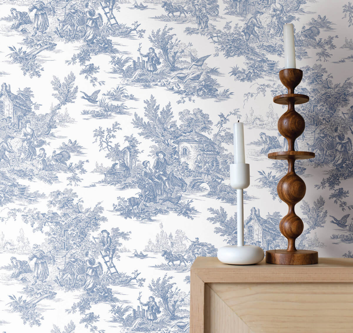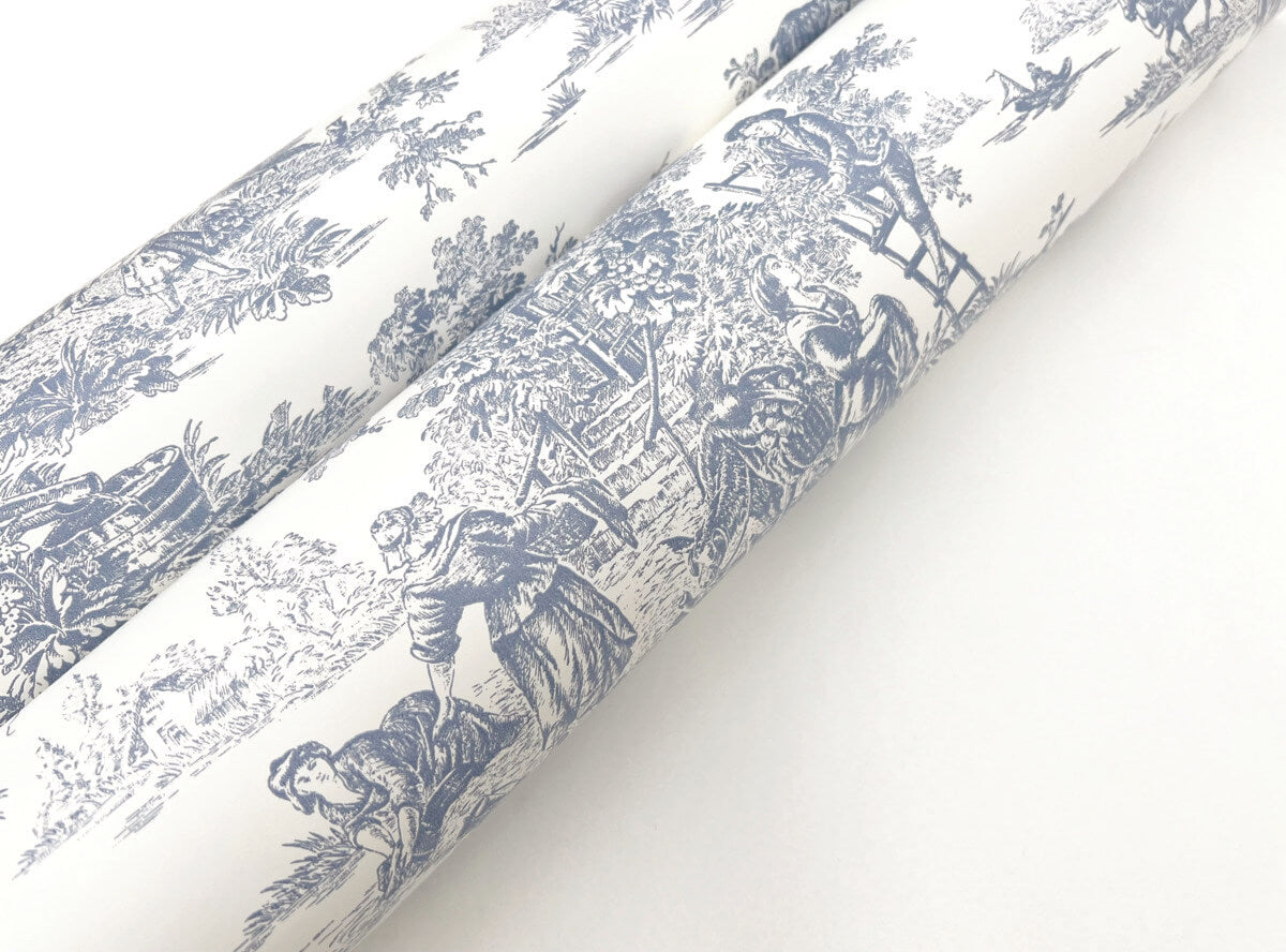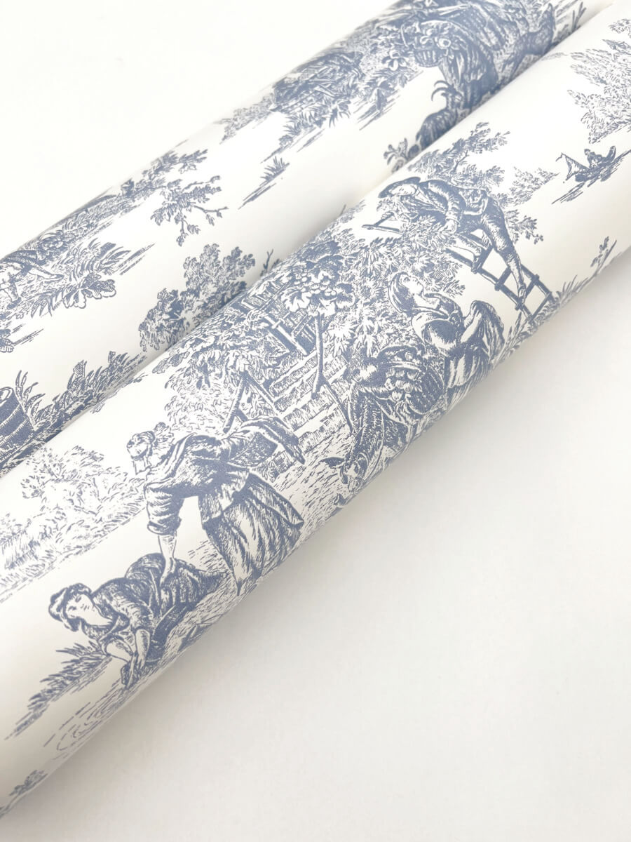 Campagne Toile's serene pastoral harvest scenes are lovingly illustrated in periwinkle-blue ink against a white backdrop. This Campagne Toile Wallpaper measures approximately 20.5 inches wide by 33 feet long, measuring approximately 56.4 square feet per roll. The quintessential design for timeless romance, toile (pronounced ‘twall’) traces its origins to 18th century fabrics. This celebrated motif is explored with a range of classical reproductions and modern reimaginings.