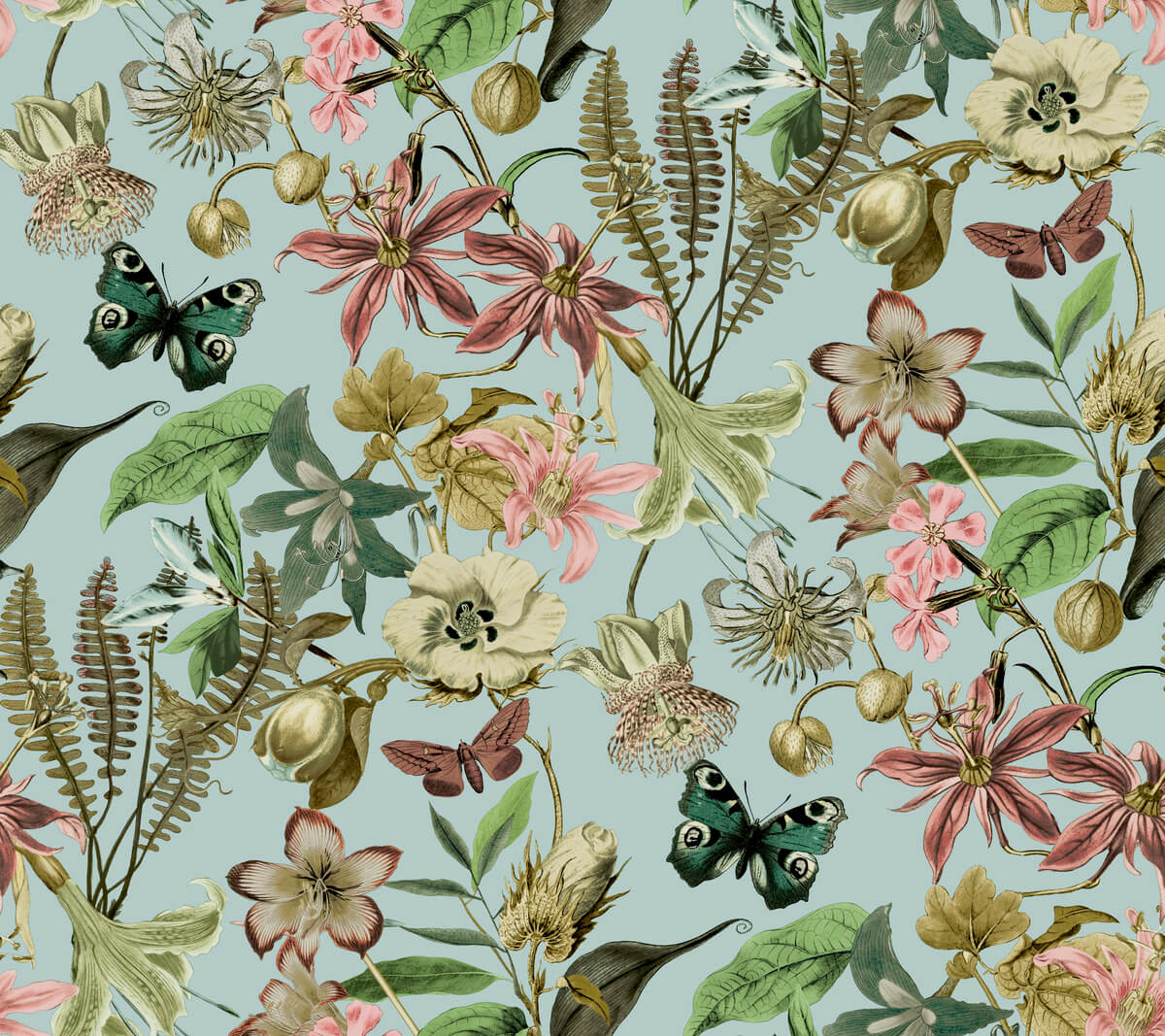 A garden of exotic blooms is visited by drifting butterflies in pattern Butterfly House featuring a color palette with green and pink on a sky blue background. This Butterfly House Wallpaper measures approximately 27 inches wide by 27 feet long, measuring approximately 60.8 square feet per roll. Florals speak the language of ever-evolving style with instant connection and iconic form that confidently compliments any space and every design signature.