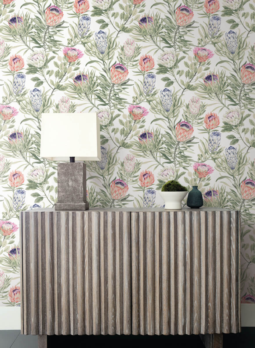 Gorgeous sugarbush blooms unfurl amongst rounded and spikey leaves in pattern Protea featuring fuchsia, blue and green on white. This Protea Wallpaper measures approximately 27 inches wide by 27 feet long, measuring approximately 60.8 square feet per roll. Florals speak the language of ever-evolving style with instant connection and iconic form that confidently compliments any space and every design signature.