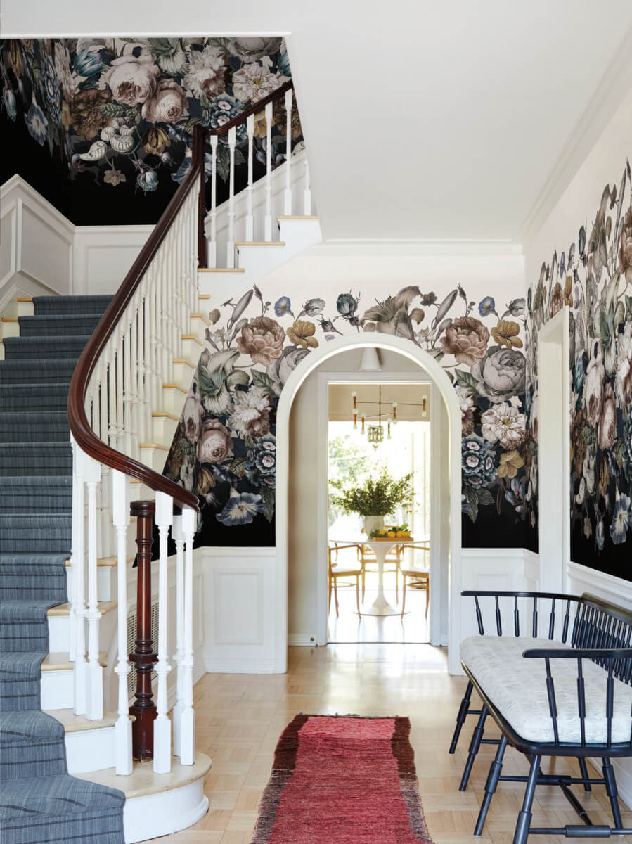 A burgeoning bouquet sits in the middle of light and dark poles in pattern Rachel Rose Mural featured in blues, reds, black and white. This Rachel Rose Mural measures approximately 54 inches wide by 10.2 feet long, measuring approximately 4.5-ft wide by 10.2-ft long when assembled. Florals speak the language of ever-evolving style with instant connection and iconic form that confidently compliments any space and every design signature.