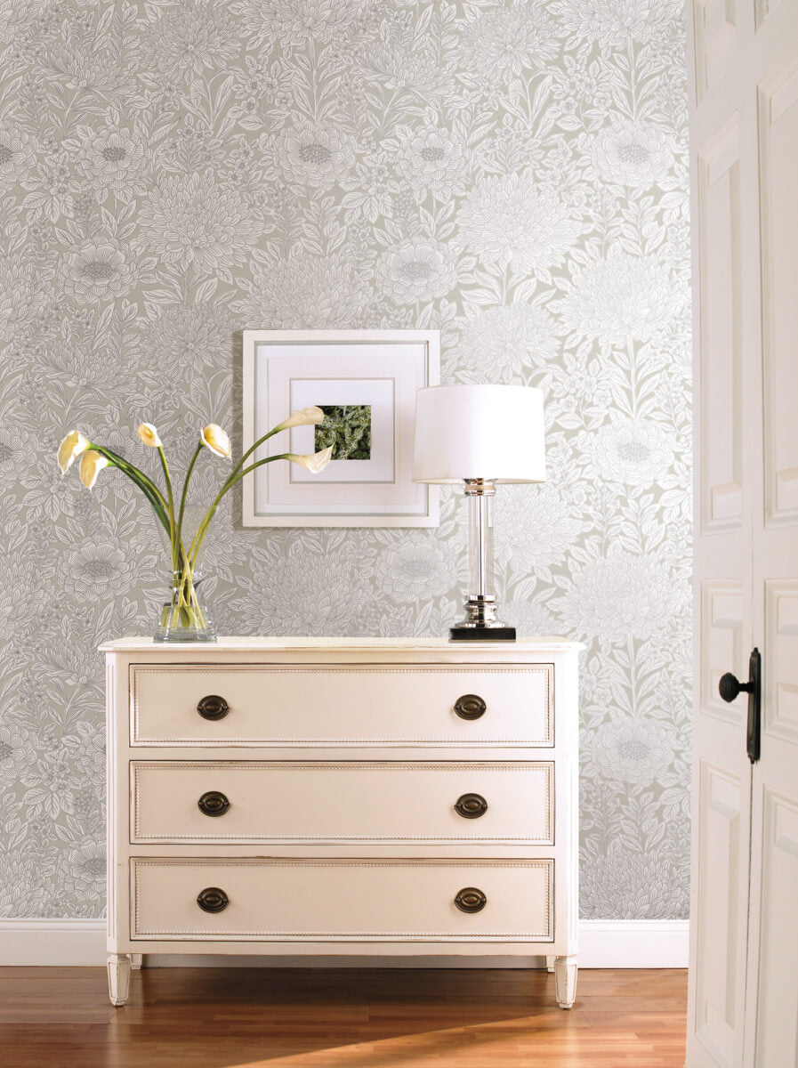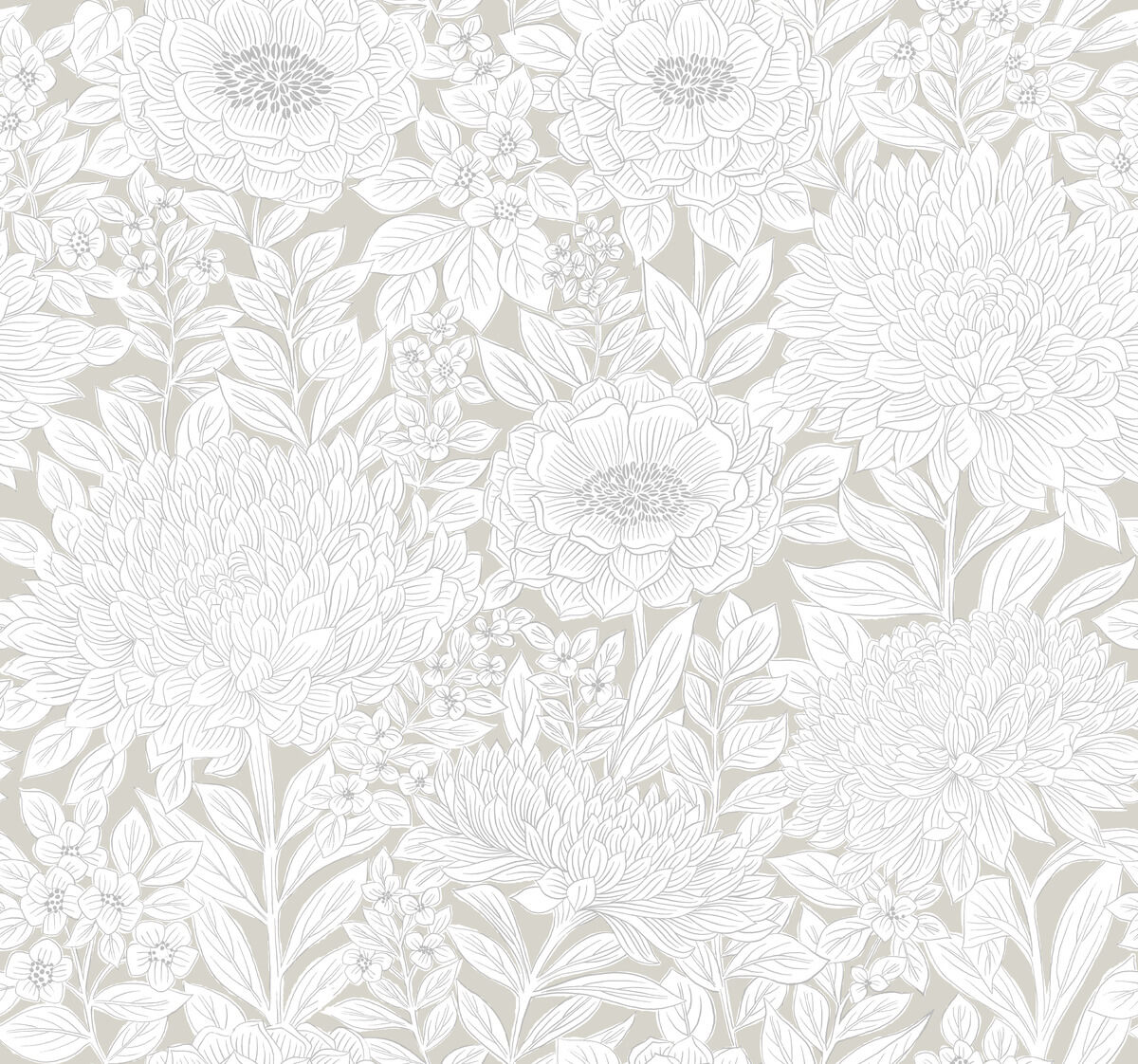 York Black & White Wood Block Blooms Wallpaper - Taupe & Silver