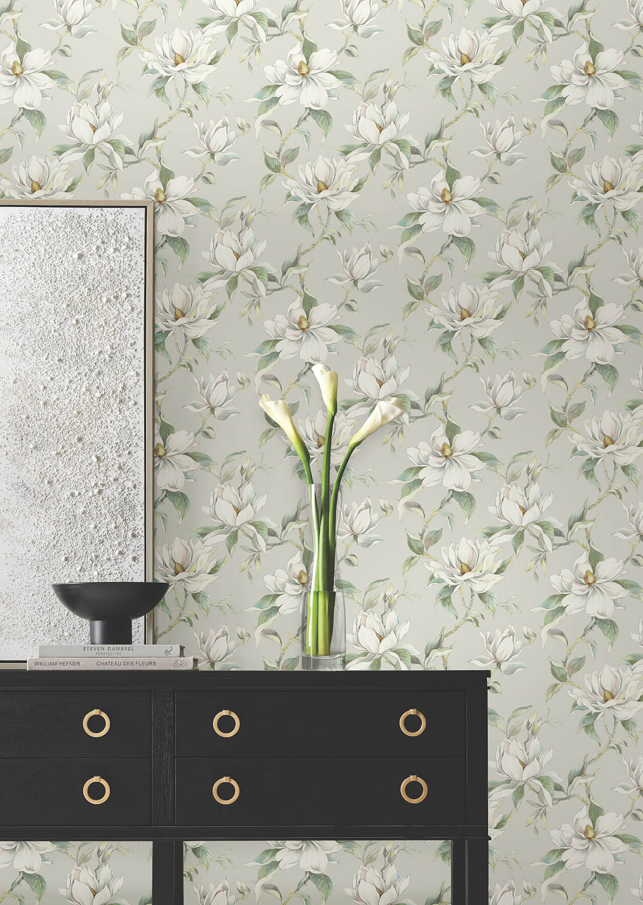 Floating Magnolia blossoms sway among delicate stems and leaves in the formal botanical Garden Jewels, featured in warm gray, green, and white. This Garden Jewels Wallpaper measures approximately 27 inches wide by 27 feet long, measuring approximately 60.8 square feet per roll. Candice Olson’s signature aesthetic defines timeless modern style. Decadence Second Edition features a gallery of glamorous specialty and luminous metallics dedicated to luxury living. Elevate your space with the timeless modern elegance of Candice Olson. The Decadence Second Edition wallpaper collection showcases luxurious textures, shimmering metallic finishes, and refined patterns designed for upscale interiors. From luminous specialty wallpapers to sophisticated statement designs, this collection embodies the essence of high-end, contemporary style, perfect for adding glamour and depth to any room.