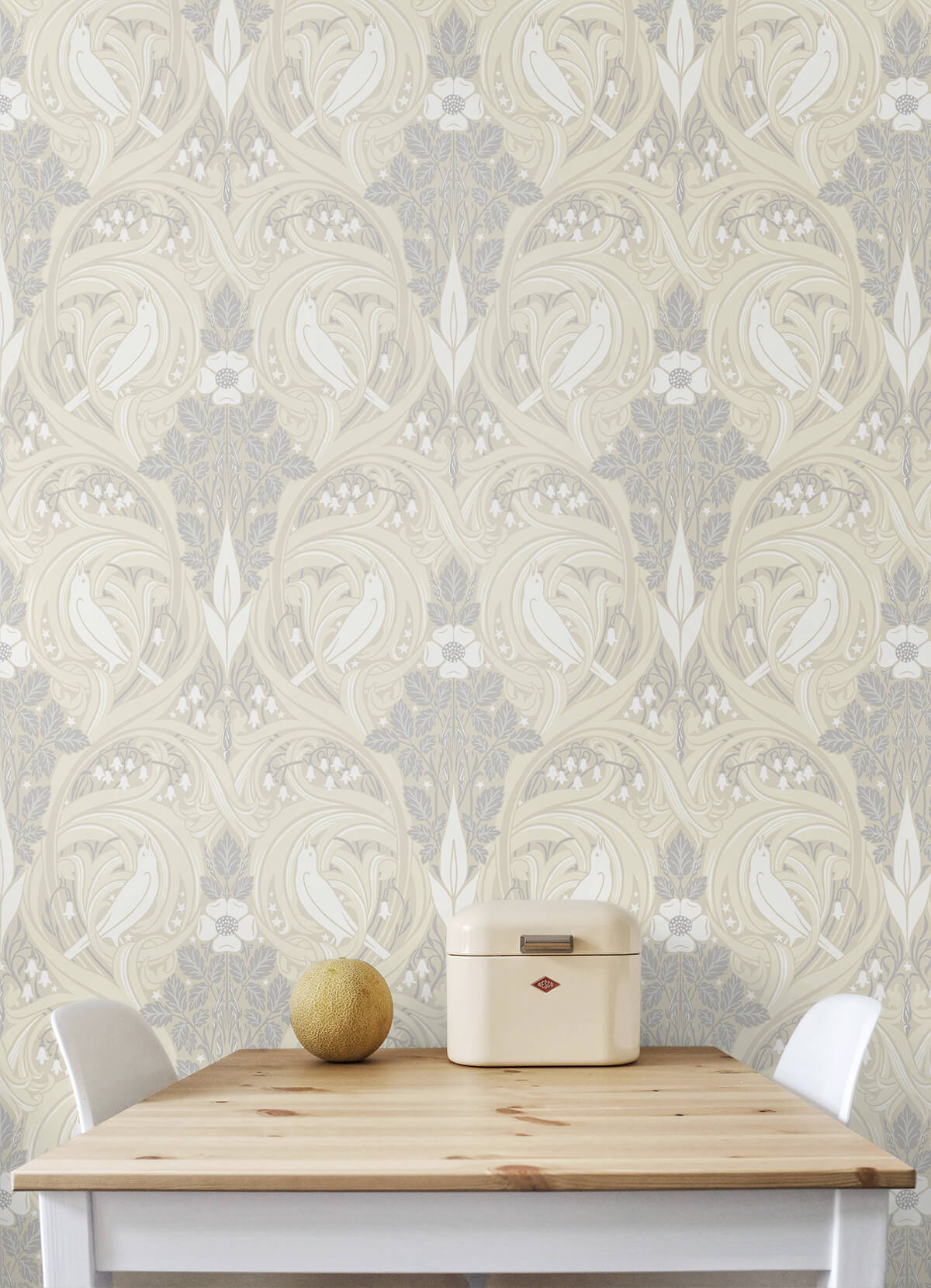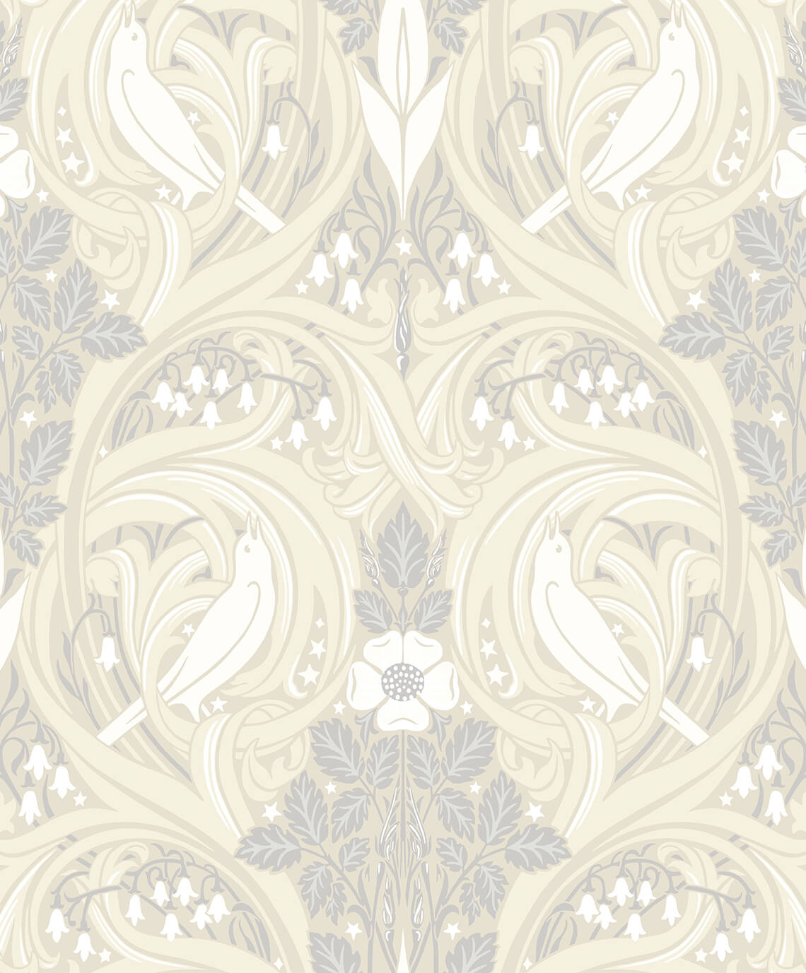 Seabrook Legacy Prints Bird Scroll Wallpaper - Swiss Coffee & Grey