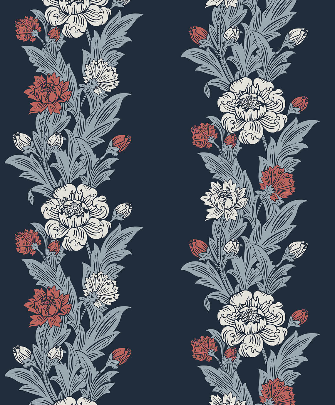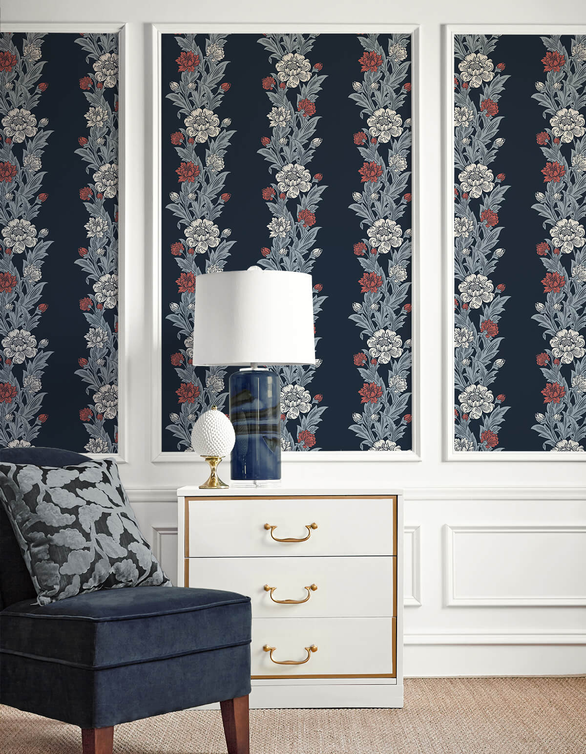Seabrook Legacy Prints Blooming Stripe Wallpaper - Deep Navy & Berry