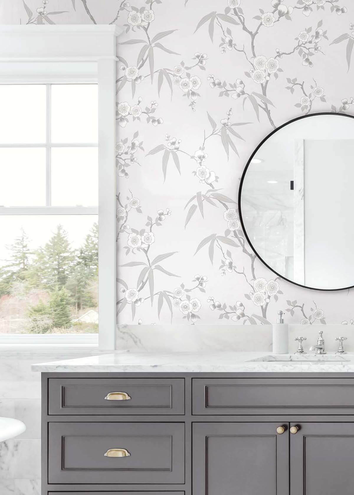 Seabrook White Heron Floral Blossom Trail Wallpaper - Soft Grey