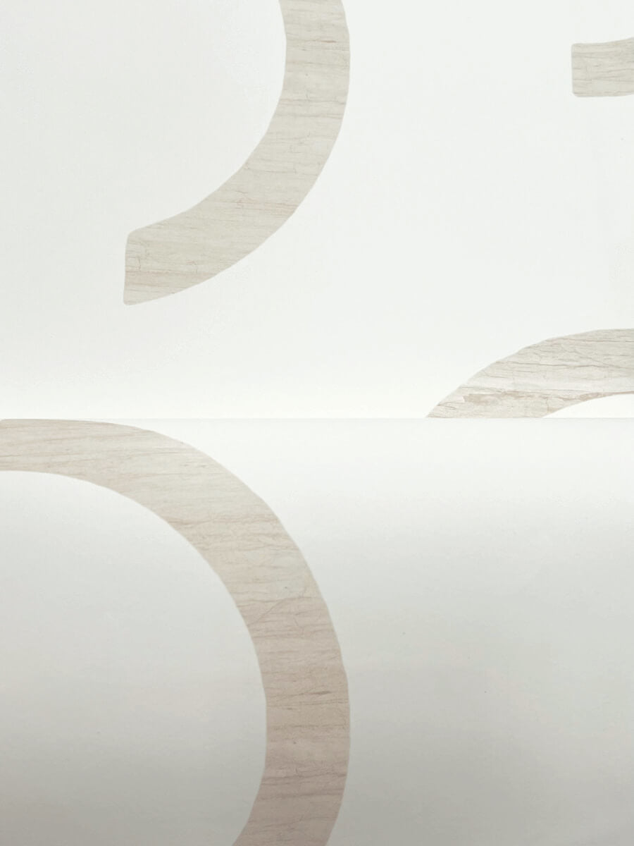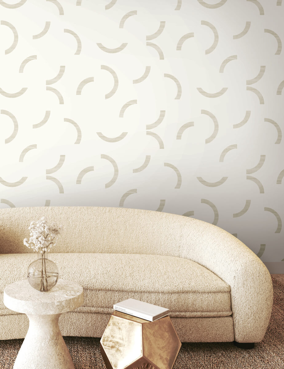 This modern geometric design features a variety of thin crescents embellished with striated layers of white and pale grey. This Lunula Wallpaper measures approximately 27 inches wide by 27 feet long, measuring approximately 60.8 square feet per roll. Textural, organic forms grounded in earthly inspiration.