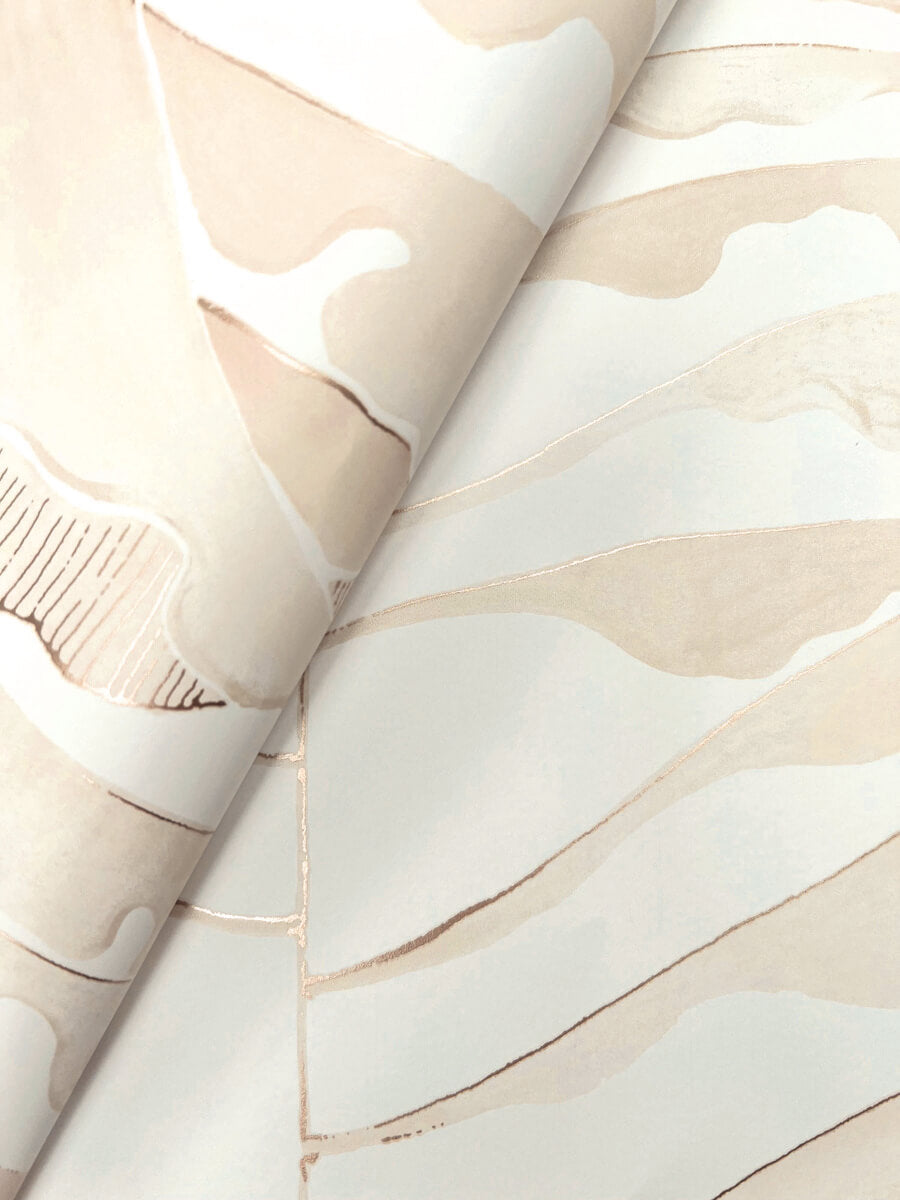 An organic take on striped accents, Leaf Column's illustrative design features thin, curling fronds watercolored in shades of taupe, pale grey, and rose along a central connective stem embellished with golden highlights. This Leaf Column Wallpaper measures approximately 27 inches wide by 27 feet long, measuring approximately 60.8 square feet per roll. Textural, organic forms grounded in earthly inspiration.