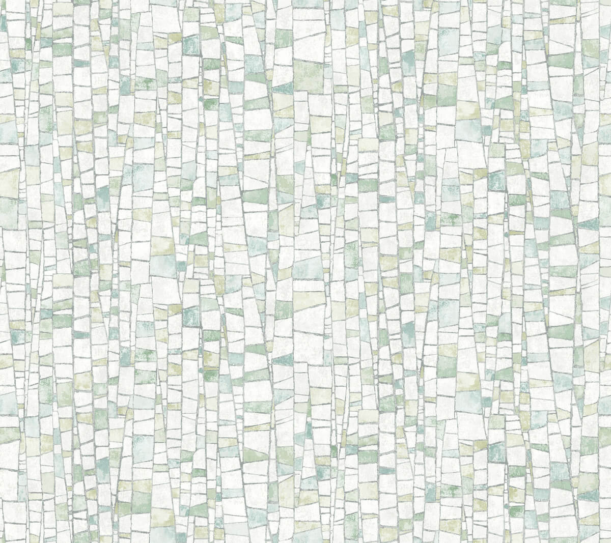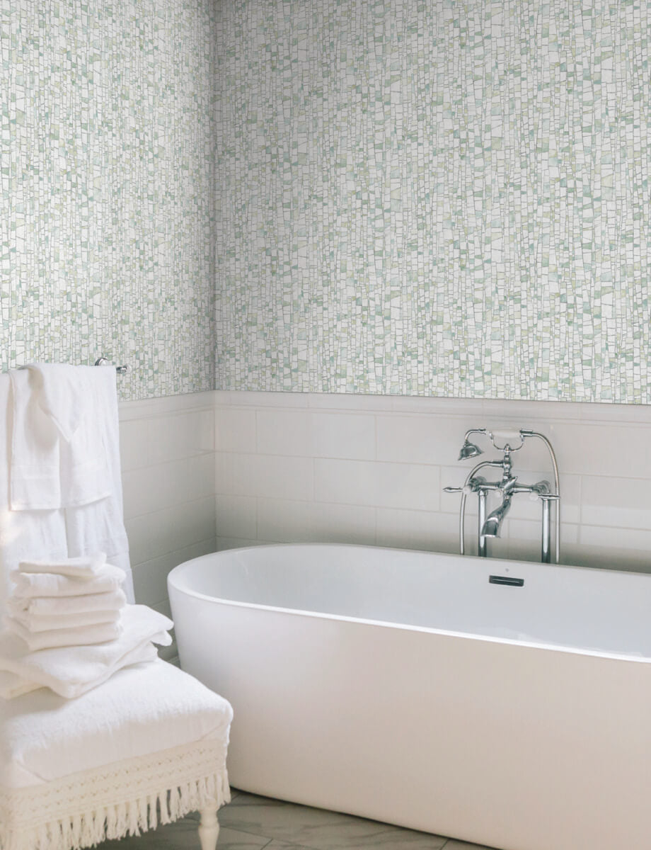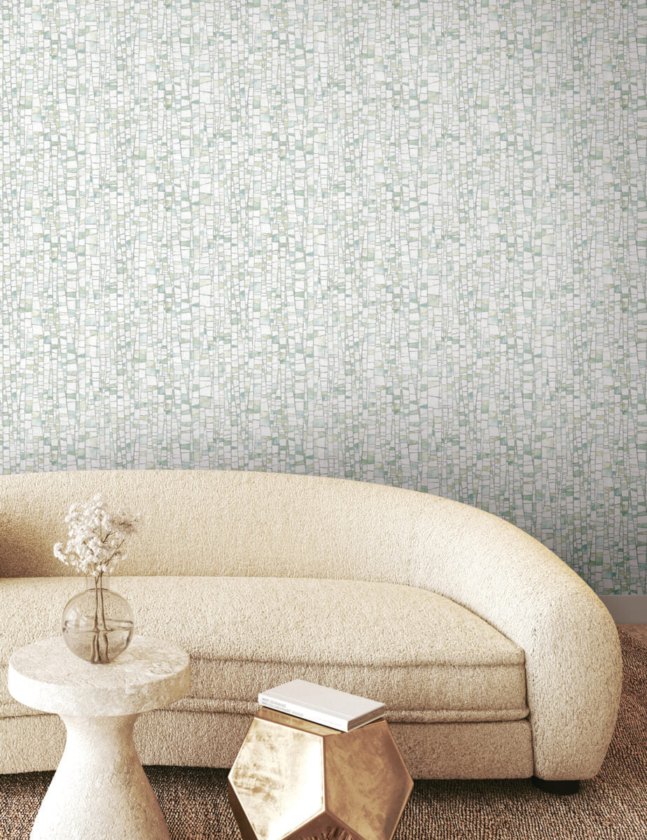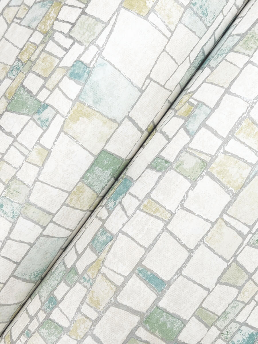 The mosaic-like tiling of design Kaleidoscopic strikes the perfect balance of rustic and refined, featuring a variety of spring greens, creamy white, and grey accented by metallic silver highlights. This Kaleidoscopic Wallpaper measures approximately 27 inches wide by 27 feet long, measuring approximately 60.8 square feet per roll. Textural, organic forms grounded in earthly inspiration.