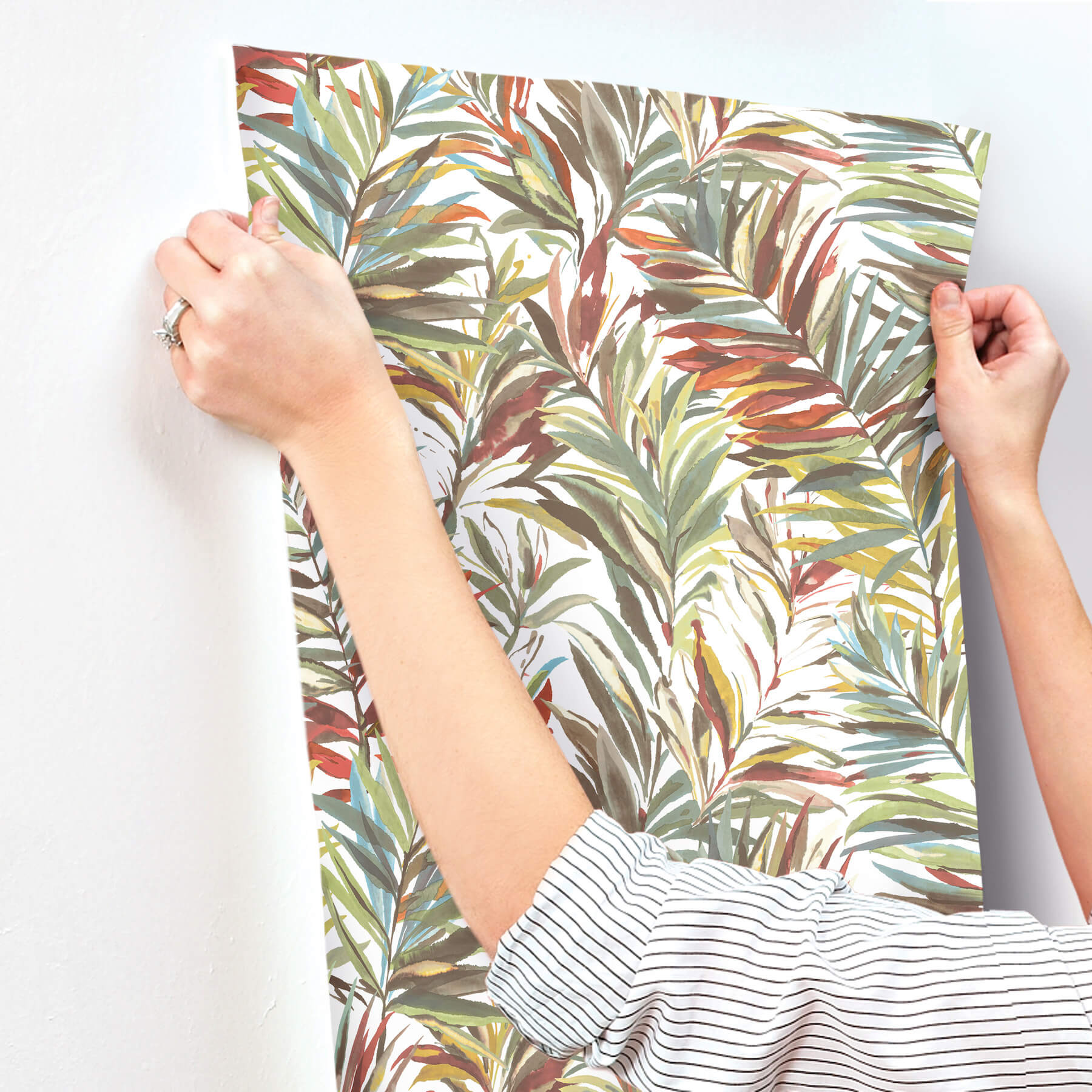 Enjoy luxurious seclusion with Swaying Palms' sophisticated and organic privacy screen composed of lush, overlapping fronds. Featured here in shades of vibrant green and teal accented with rich red and oxblood hues. This Swaying Palms Wallpaper measures approximately 27 inches wide by 27 feet long, measuring approximately 60.8 square feet per roll. The song of the forest echoes within the rich, earthen textures and greenery of this nature-inspired collection.