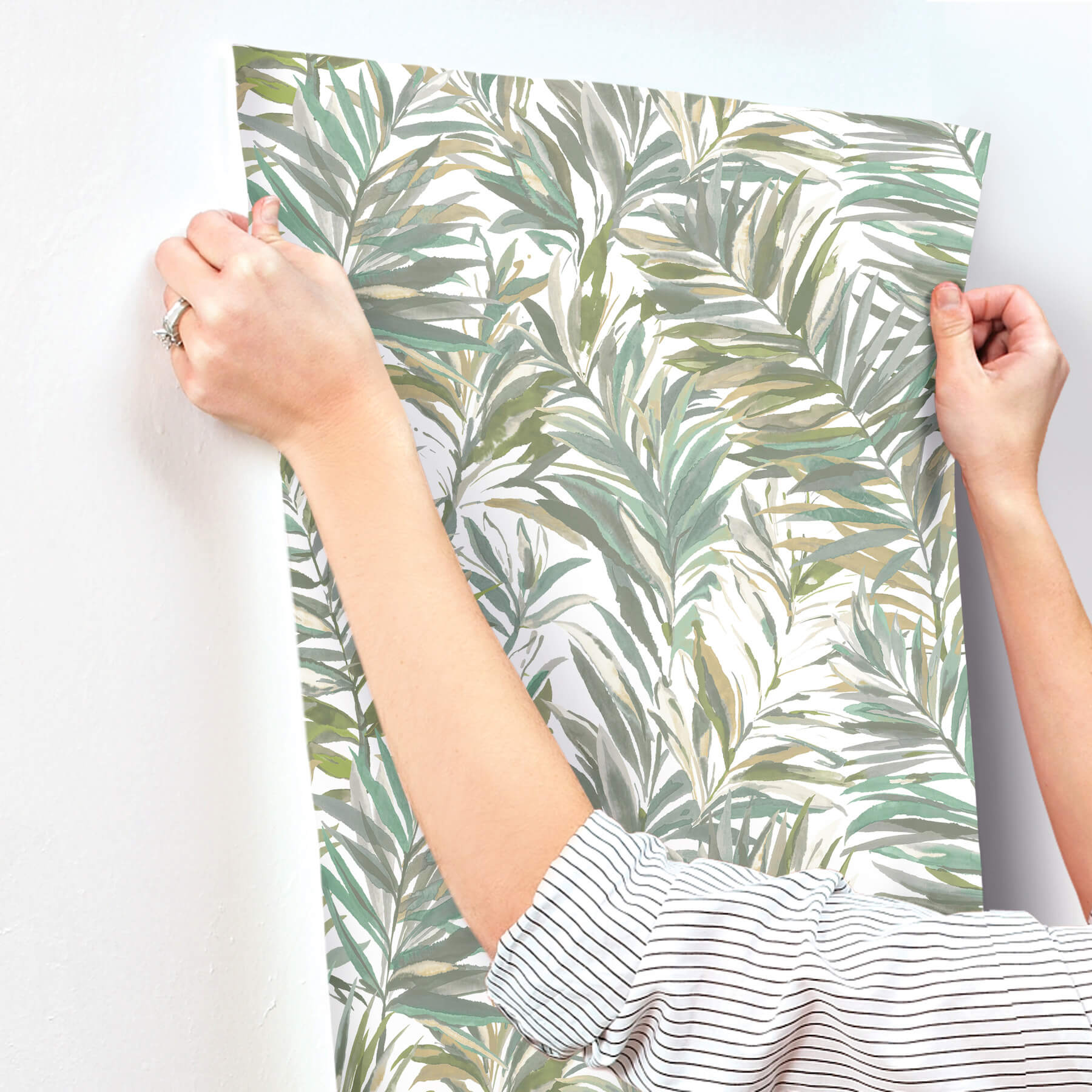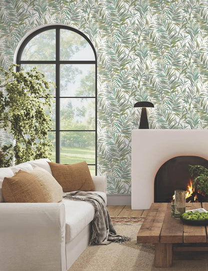 Enjoy luxurious seclusion with Swaying Palms' sophisticated and organic privacy screen composed of lush, overlapping fronds. Featured here in shades of verdant green, olive, aqua, teal, and grey. This Swaying Palms Wallpaper measures approximately 27 inches wide by 27 feet long, measuring approximately 60.8 square feet per roll. The song of the forest echoes within the rich, earthen textures and greenery of this nature-inspired collection.