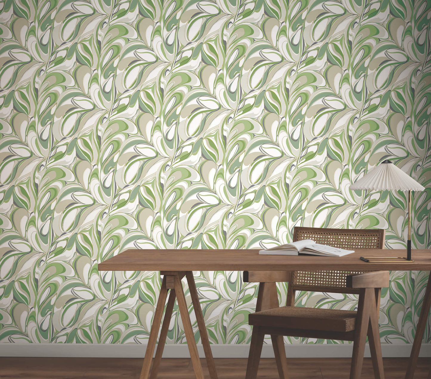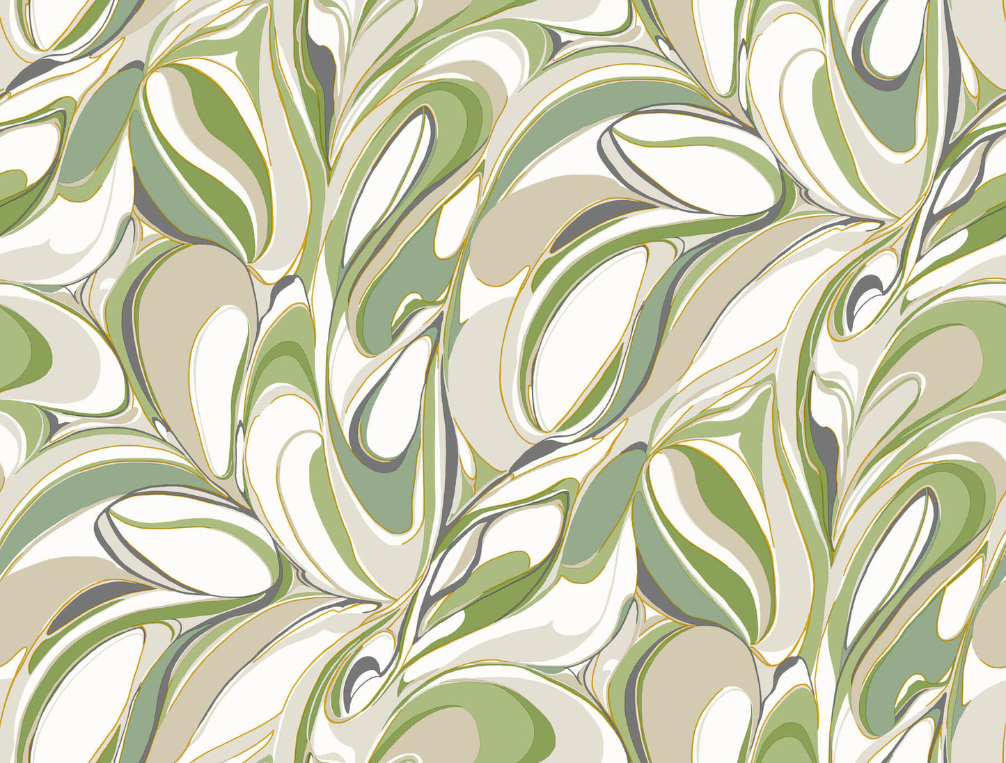 Achate's organic swirls of marbled ink are elevated with thin metallic veins throughout. Seen here in a palette of green, beige, white, blue, and gold. This Achate Wallpaper measures approximately 27 inches wide by 27 feet long, measuring approximately 60.8 square feet per roll. The song of the forest echoes within the rich, earthen textures and greenery of this nature-inspired collection.