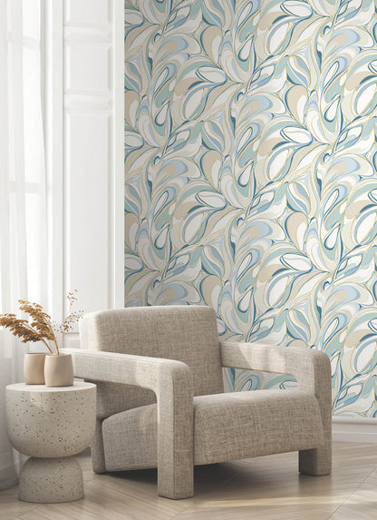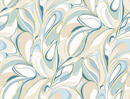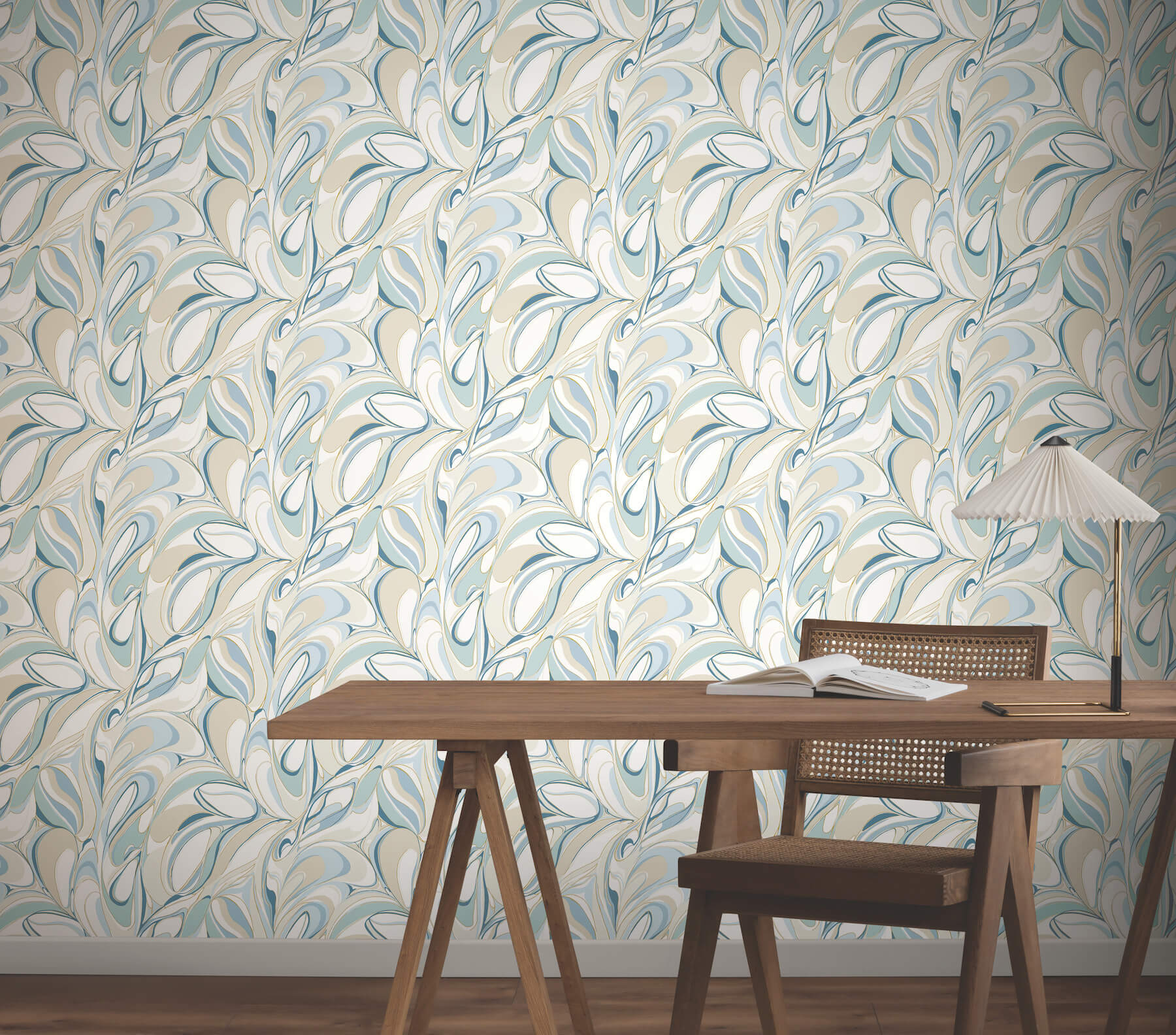 Achate's organic swirls of marbled ink are elevated with thin metallic veins throughout. Seen here in a palette of blue, aqua, beige, white, and gold. This Achate Wallpaper measures approximately 27 inches wide by 27 feet long, measuring approximately 60.8 square feet per roll. The song of the forest echoes within the rich, earthen textures and greenery of this nature-inspired collection.